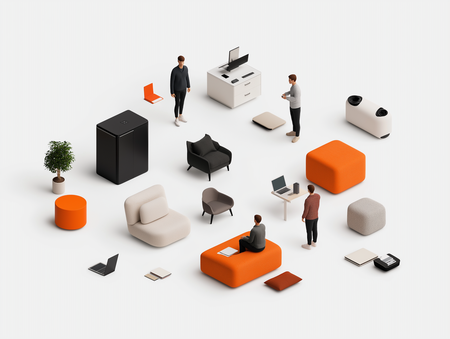 Modern isometric illustration of furniture, tech, and people in a clean layout with orange, black, and white tones.