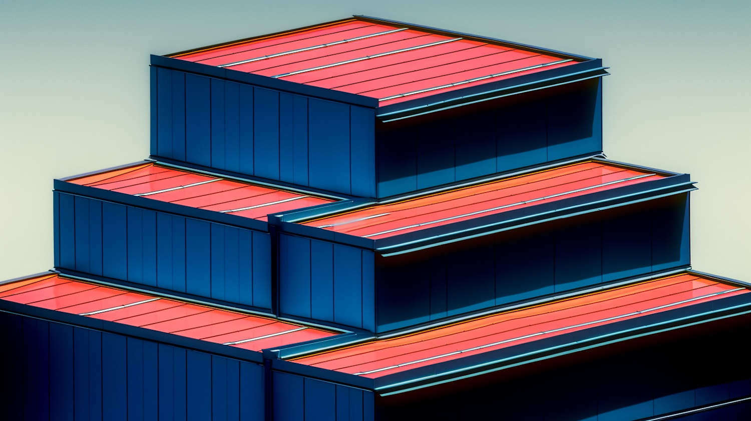 Stacked blue shipping containers with red tops create a striking geometric pattern against a gradient background.