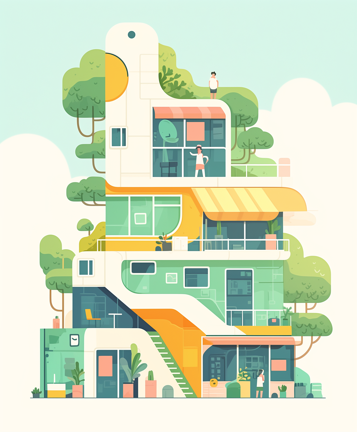 Whimsical multi-story building illustration with vibrant colors, geometric design, and stylized trees against a serene sky.