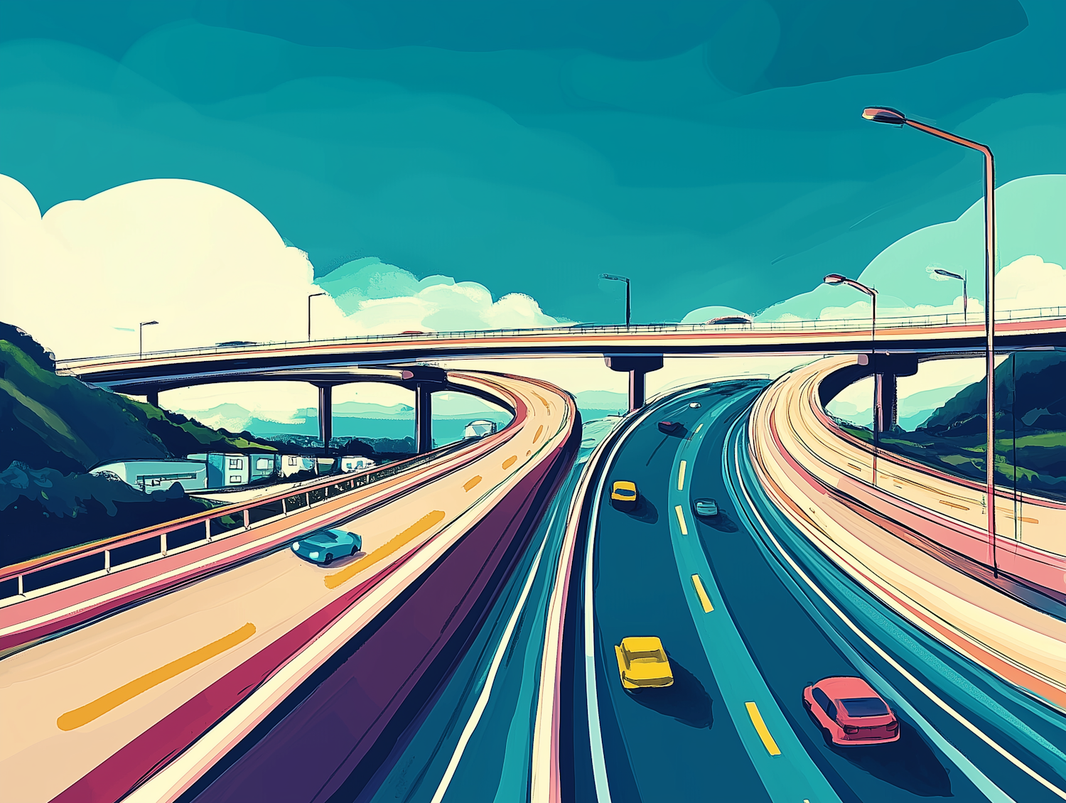 Stylized illustration of a highway interchange with colorful cars, dynamic curves, and a bright blue sky. Perfect for urban and travel themes.