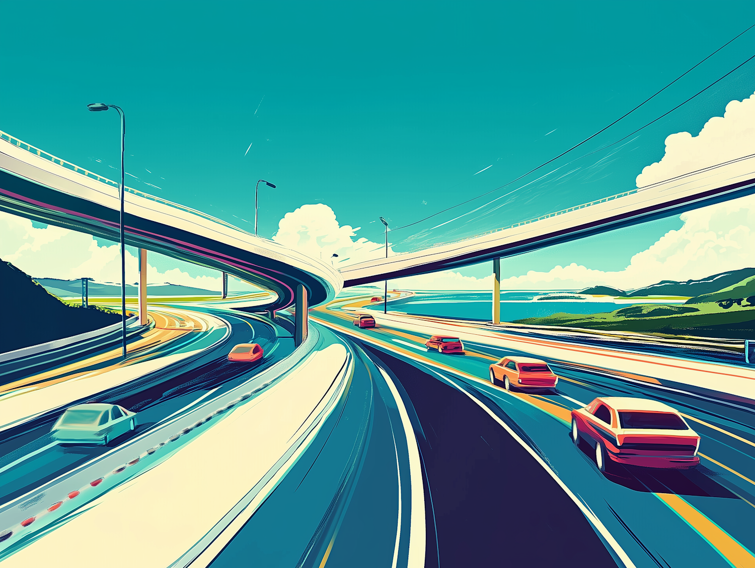 Stylized highway illustration with cars on curved roads, turquoise sky, and scenic hills in the background. Bright and dynamic design.