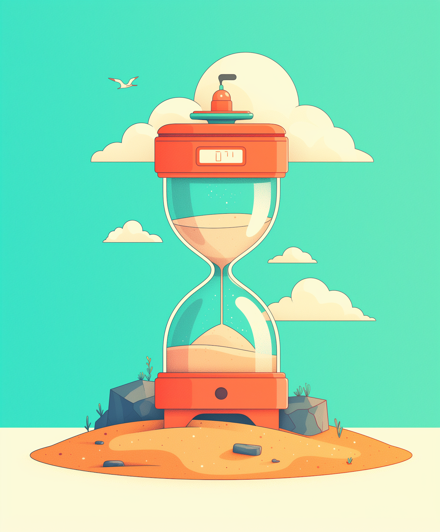 Whimsical hourglass illustration with a mechanical twist, set on sandy terrain under a bright turquoise sky with clouds.