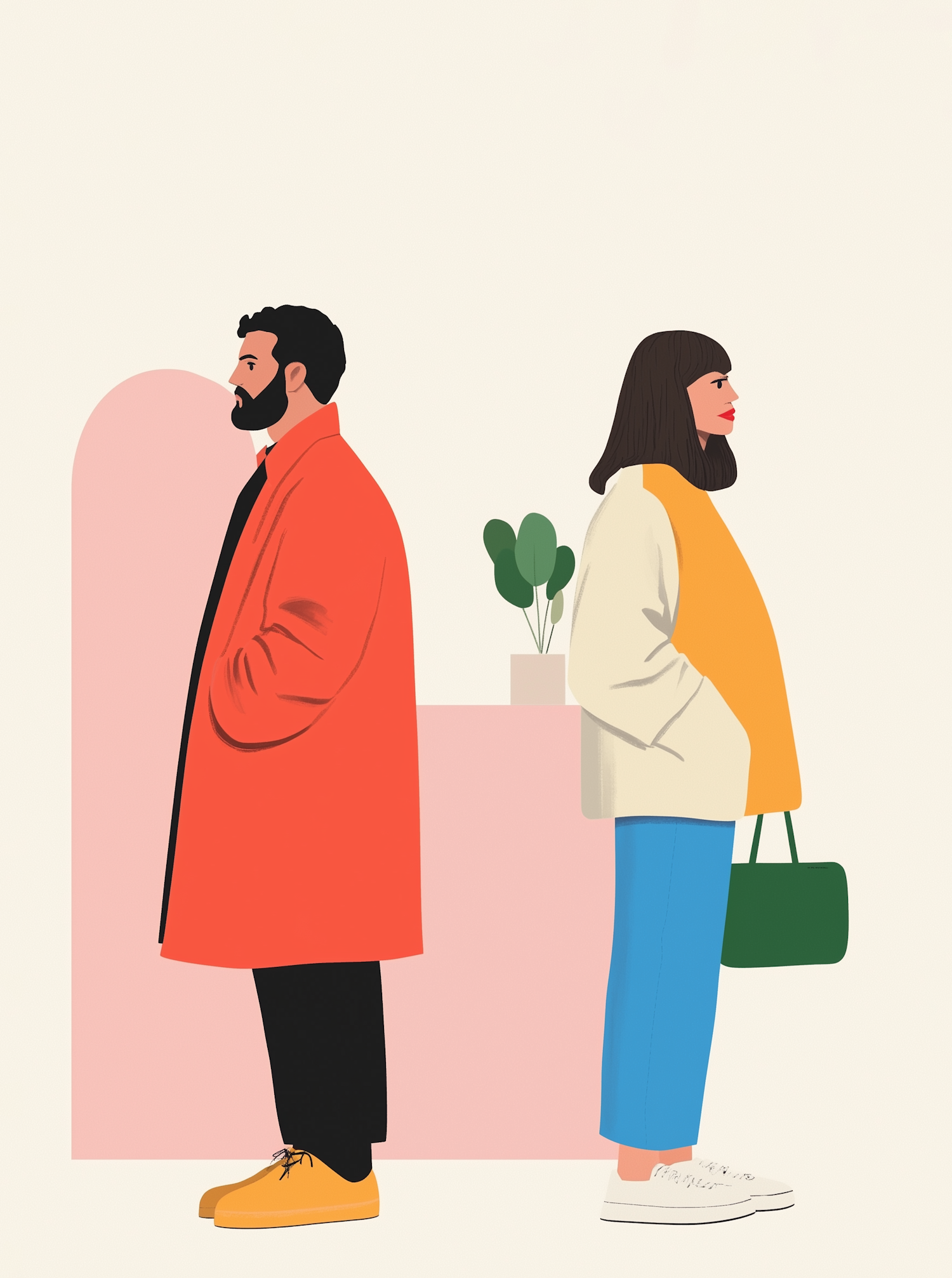 Minimalist illustration of a man and woman standing back-to-back in colorful outfits, with a plant between them on a cream background.