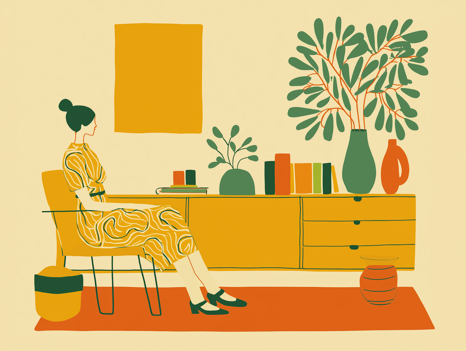 Minimalist illustration of a woman in a yellow dress sitting in a modern interior with plants, books, and warm tones.
