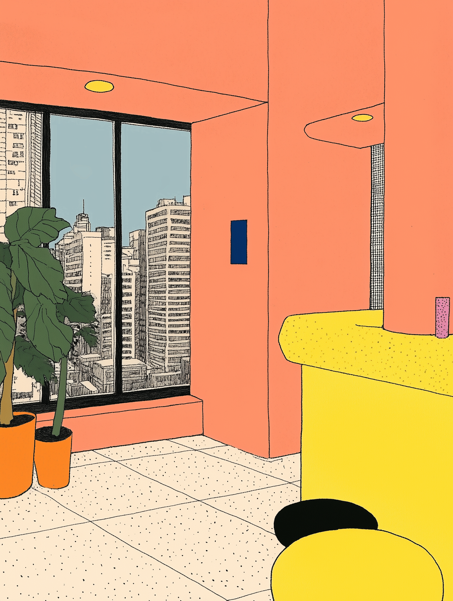Modern interior with coral walls, large window, city view, potted plant, and yellow furniture. Urban and vibrant design.