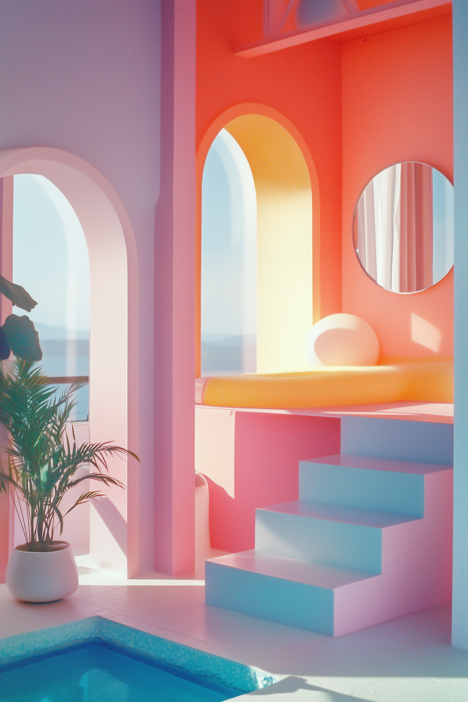 Modern interior with pastel colors, featuring blue stairs, arched windows, and a potted plant. Bright and inviting design.