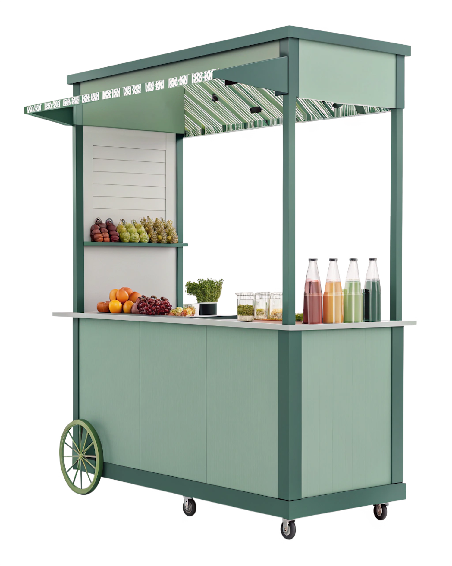 Modern green juice cart with fresh fruits, colorful juices, and a striped canopy. Perfect for outdoor events or street vending.