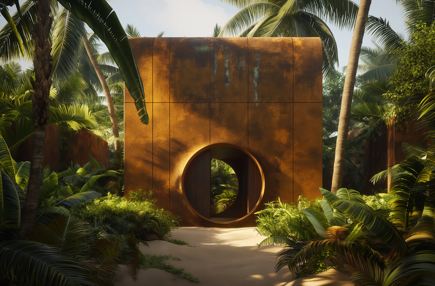 Rustic modern architecture with a circular entrance nestled in a lush tropical jungle, surrounded by vibrant greenery and palm trees.