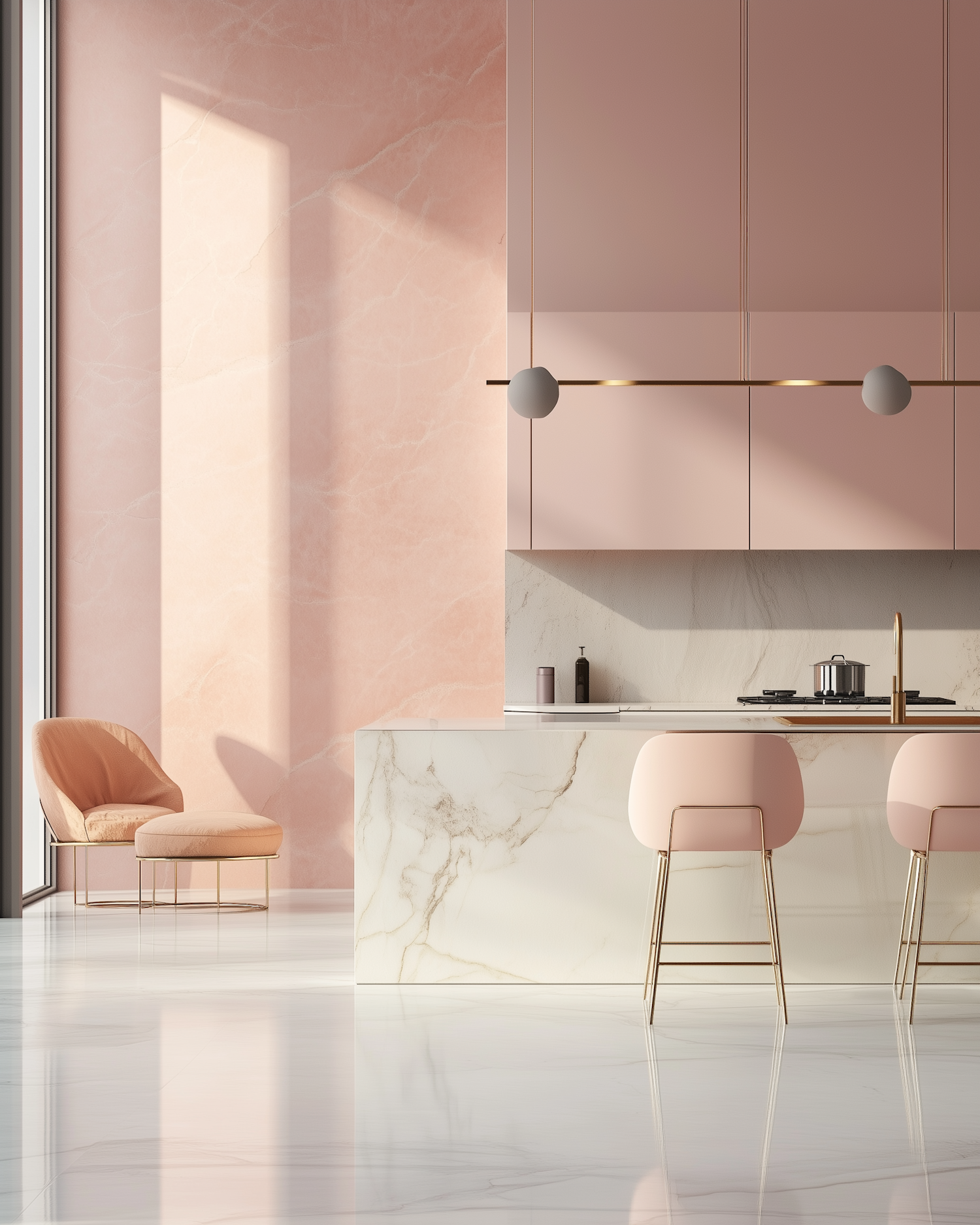 Modern kitchen with blush pink accents, marble island, gold details, and a cozy lounge chair by a sunlit window.