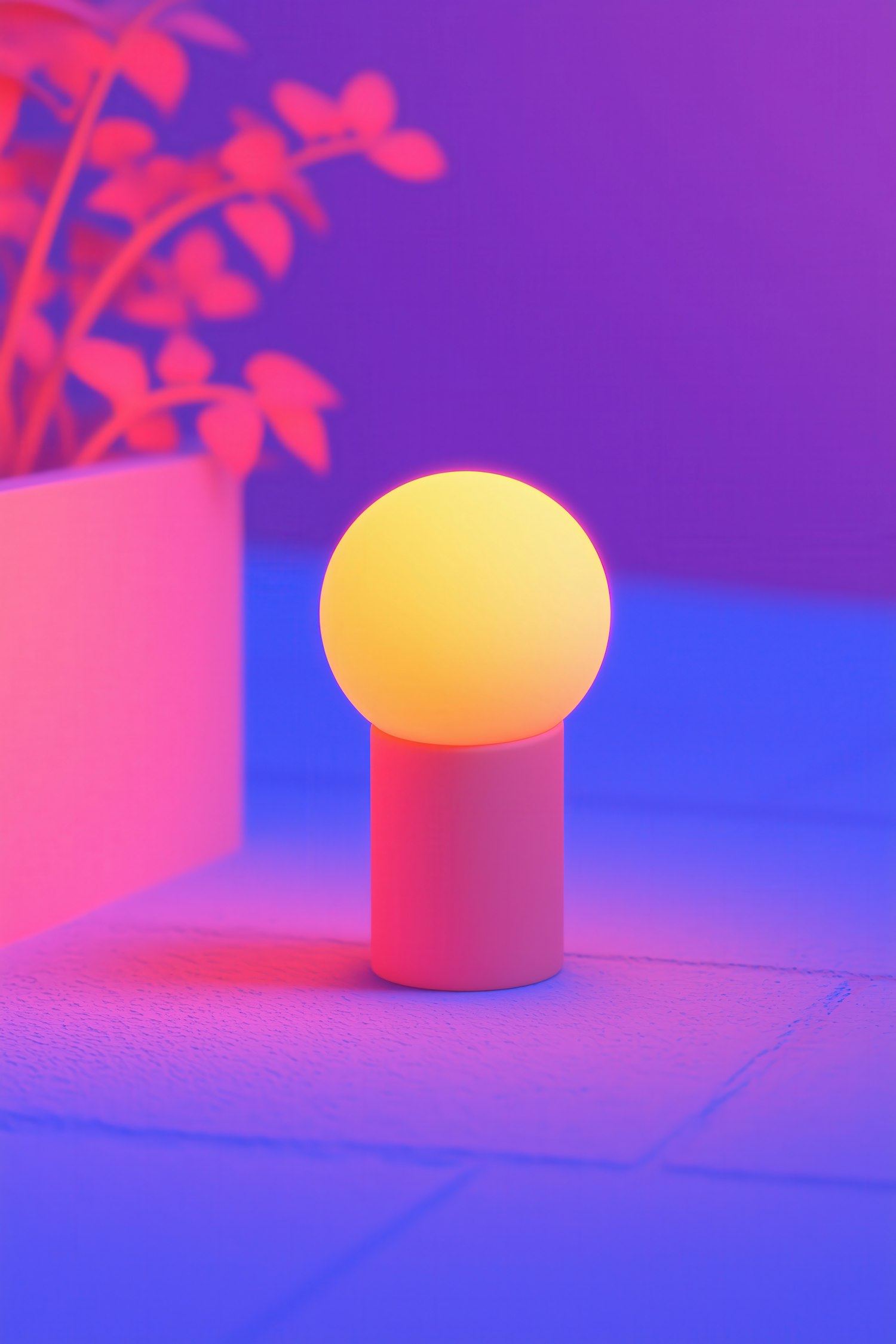 A glowing spherical lamp on a cylindrical base emits warm light, set against a vibrant purple and blue gradient background.