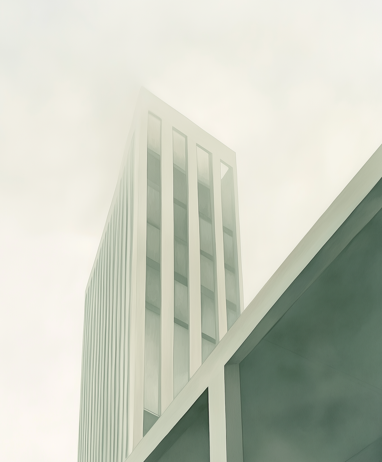 Modern building with sleek lines and misty atmosphere, featuring vertical panels and large windows in soft greens and whites.