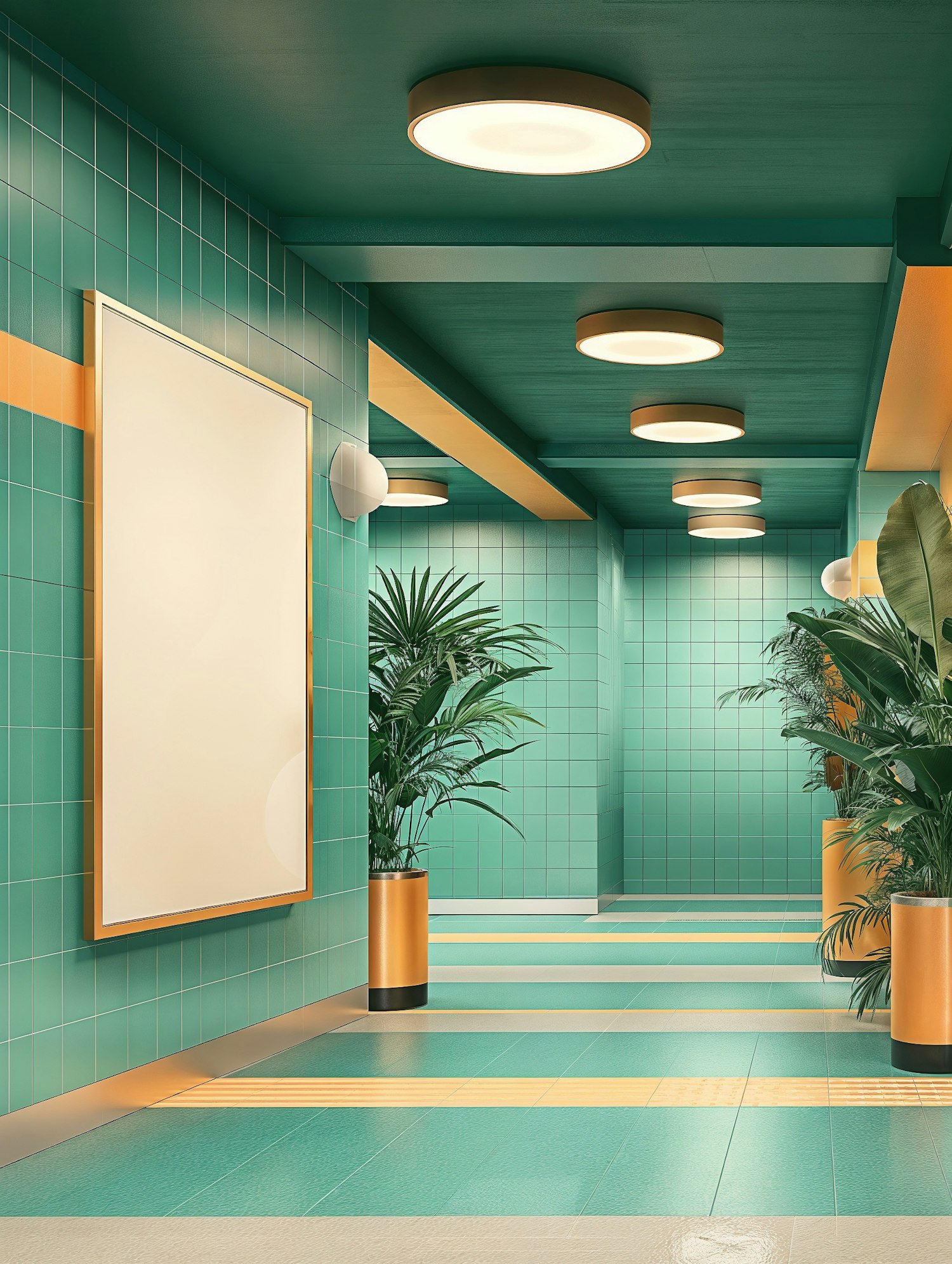 Modern teal hallway with geometric tiles, warm lighting, and lush plants. Features a blank canvas and vibrant color accents.
