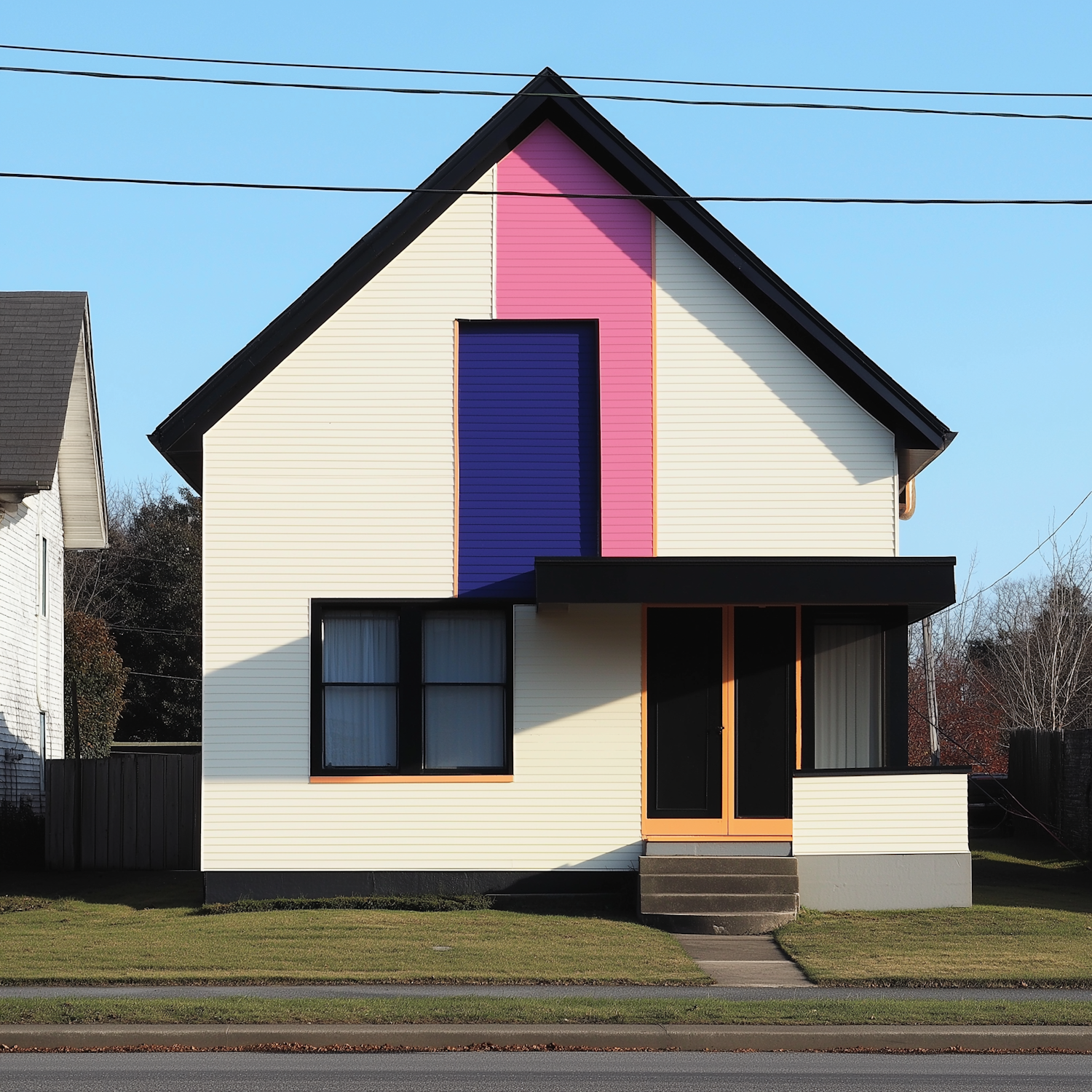 Modern house with cream walls, bold pink and blue accents, black-framed windows, and orange trim, set on a neat lawn under a clear sky.
