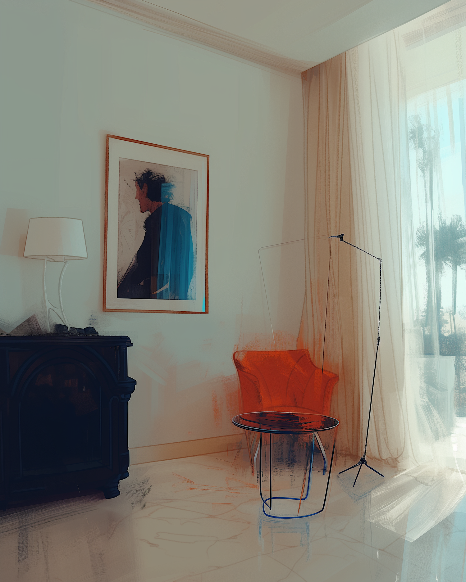 Modern room with orange chair, glass table, abstract art, and sheer curtains. Natural light creates a warm, inviting atmosphere.