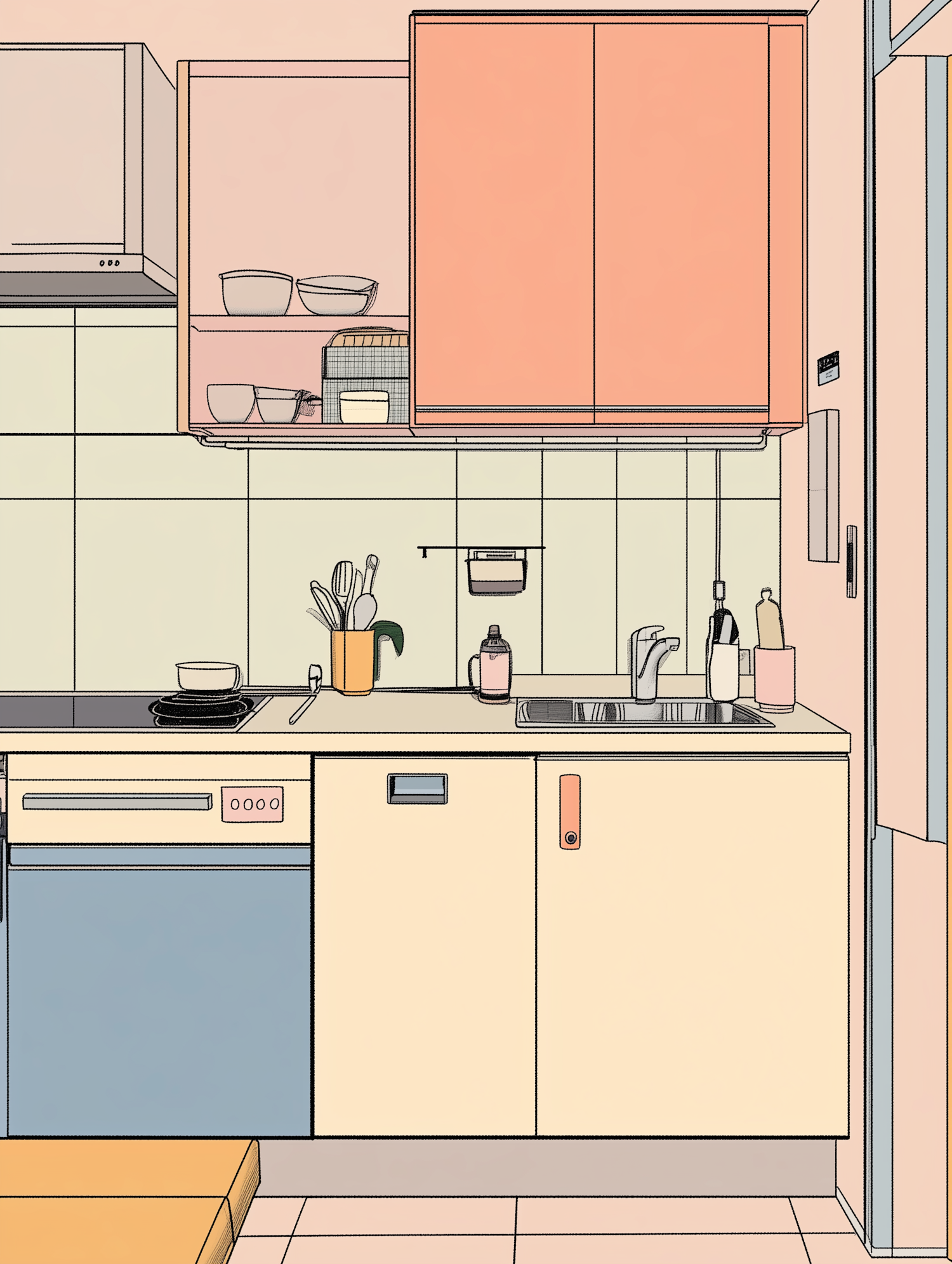 Minimalist kitchen illustration with pastel colors, featuring peach cabinets, a modern sink, and a blue dishwasher.
