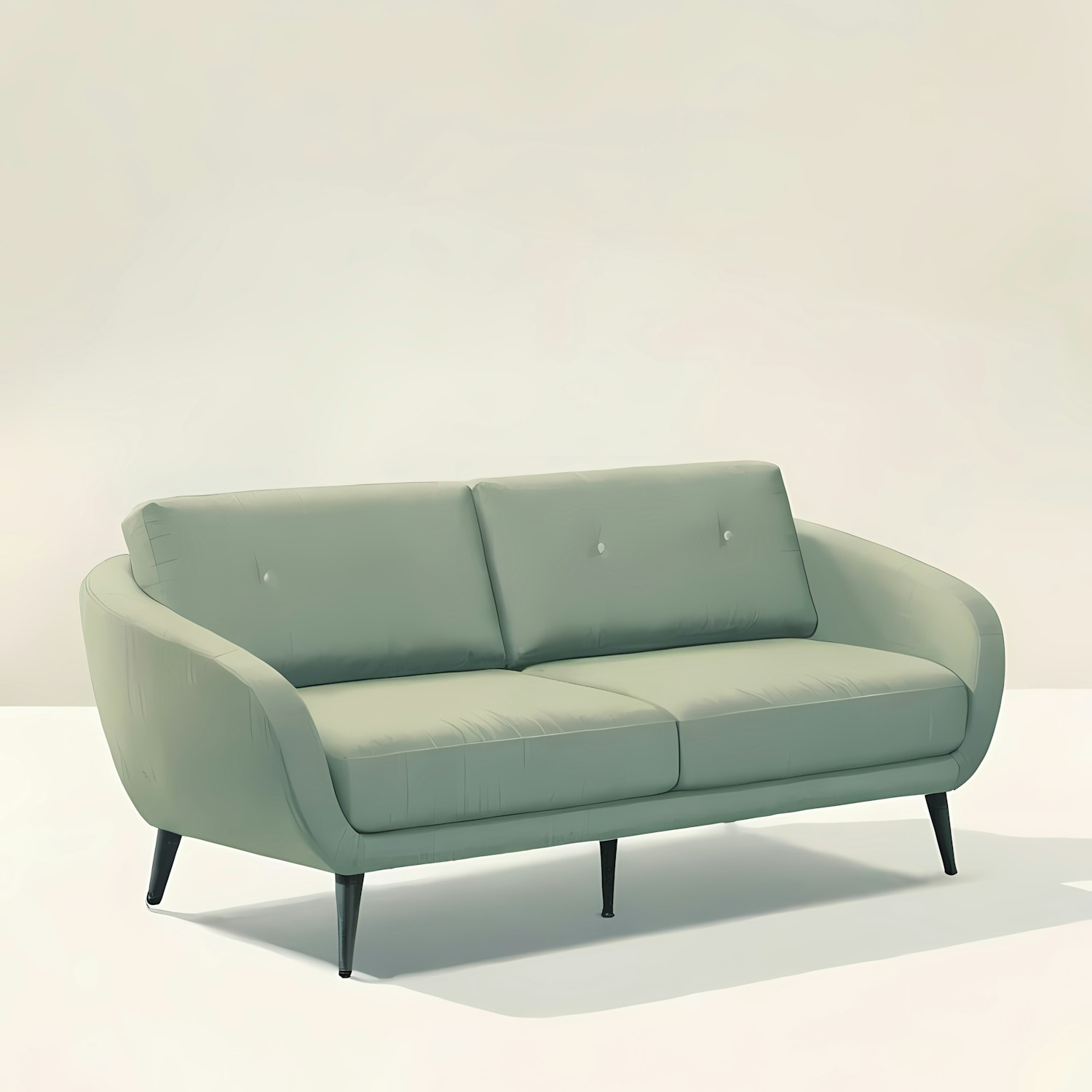 Modern pastel green sofa with curved arms and black tapered legs against a light beige background.