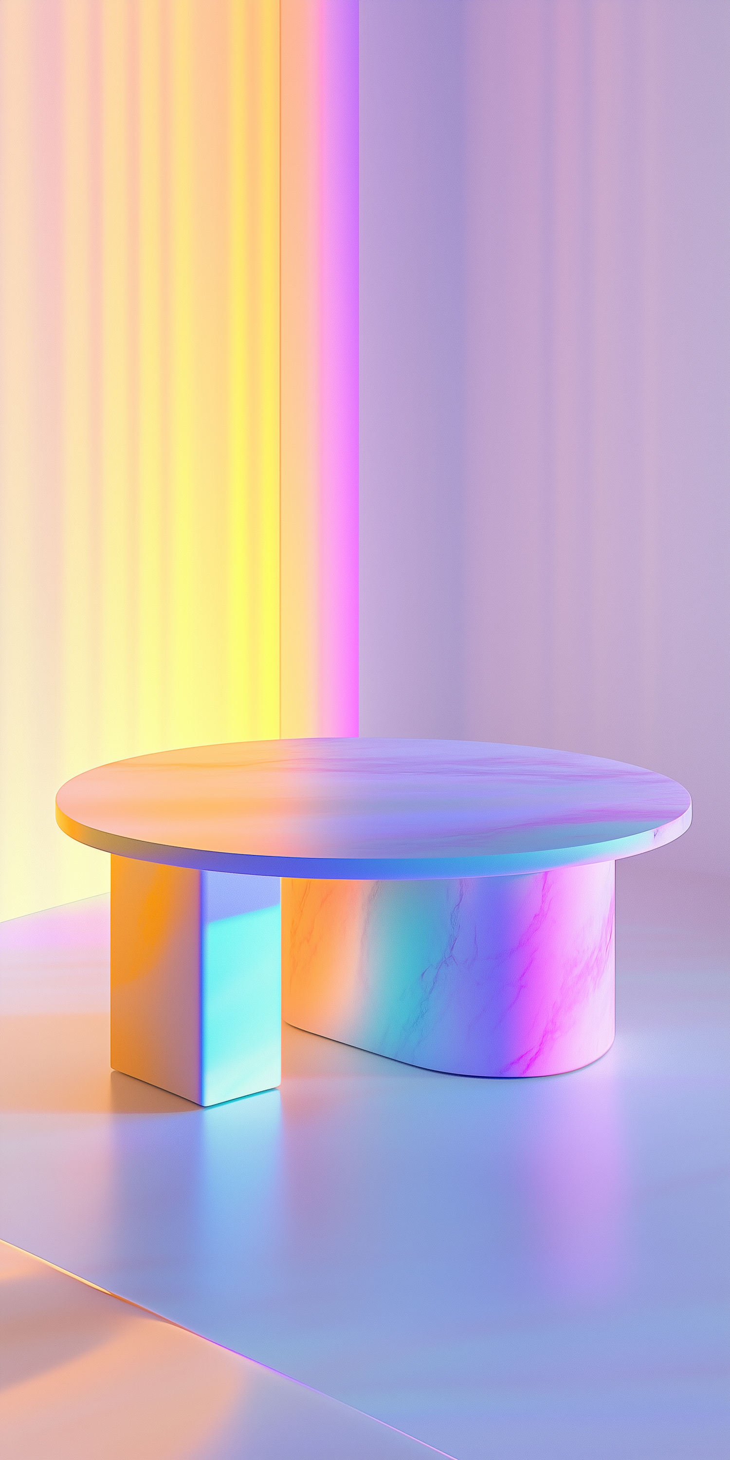 A sleek round table with a unique base, bathed in vibrant gradient lighting of yellows, pinks, purples, and blues for a modern aesthetic.
