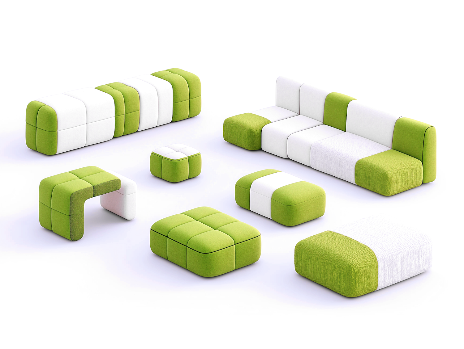 Vibrant modular furniture set in green and white with a quilted texture, including a sofa, ottomans, and a side table. Perfect for modern spaces.