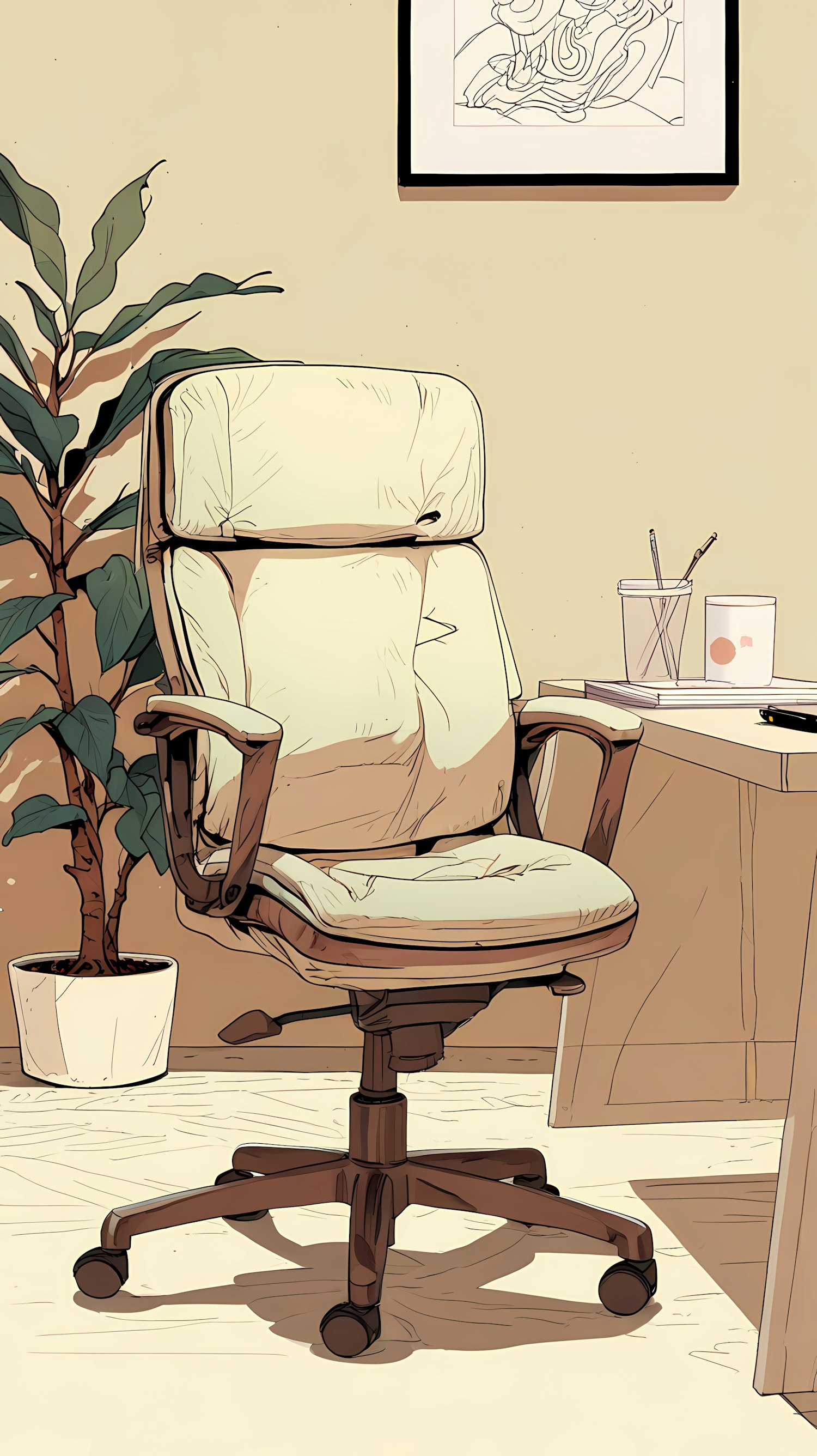 Cozy home office setting with a cushioned ergonomic chair, a green pot plant, and a minimalistic desk with organized essentials.