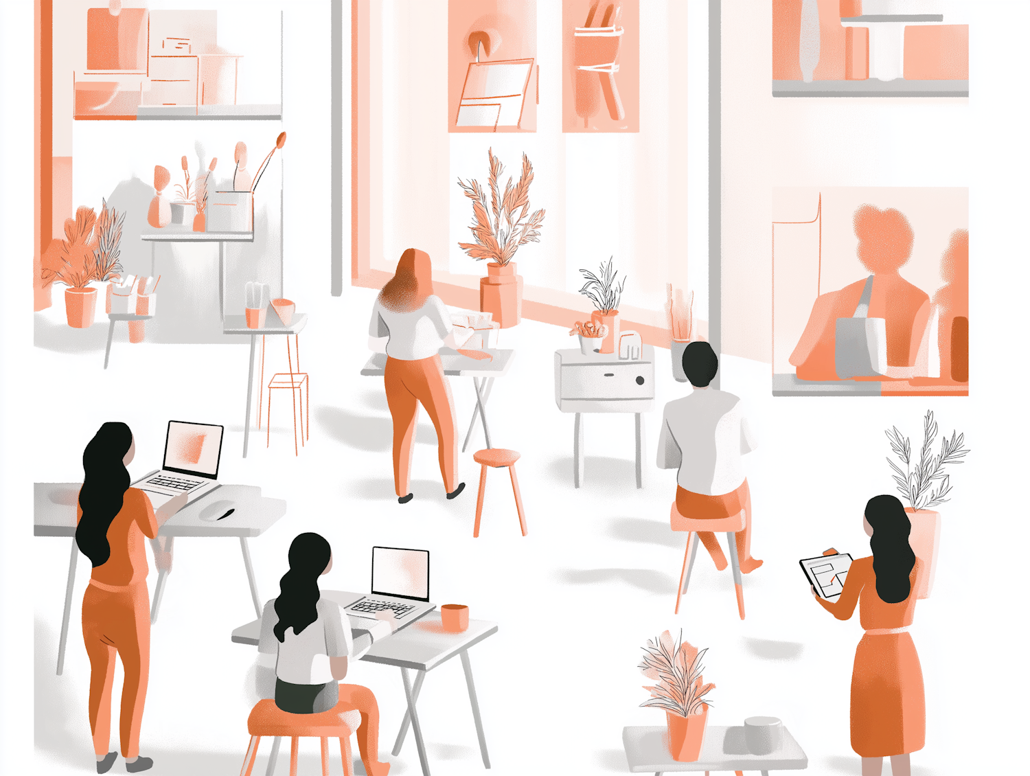 Minimalist office illustration with people working on laptops and tablets, surrounded by plants and shelves, in a warm orange and white palette.