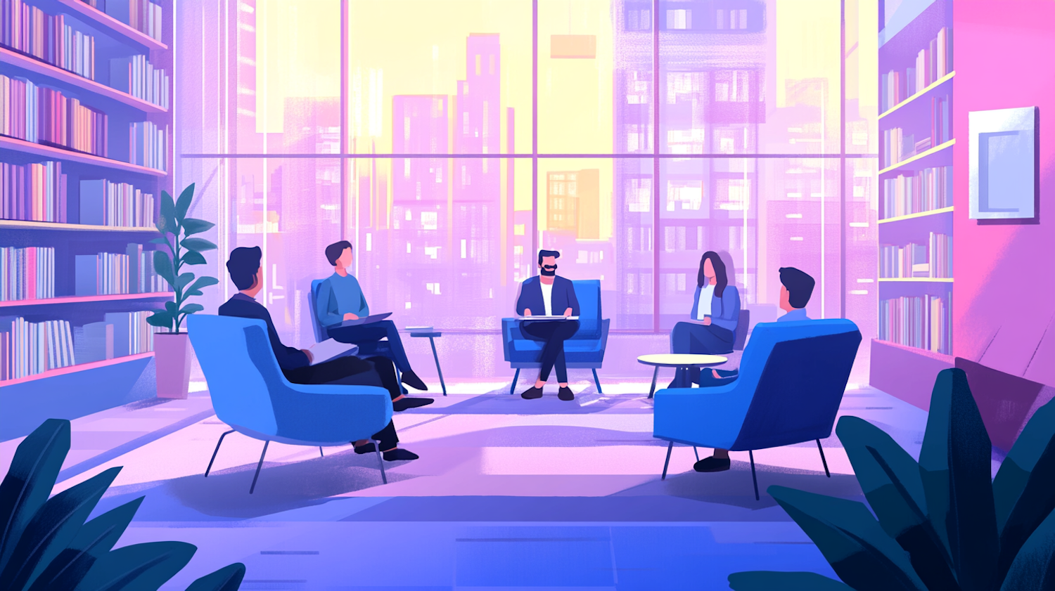 Stylized office meeting with five people in a modern, colorful room with large windows and bookshelves.