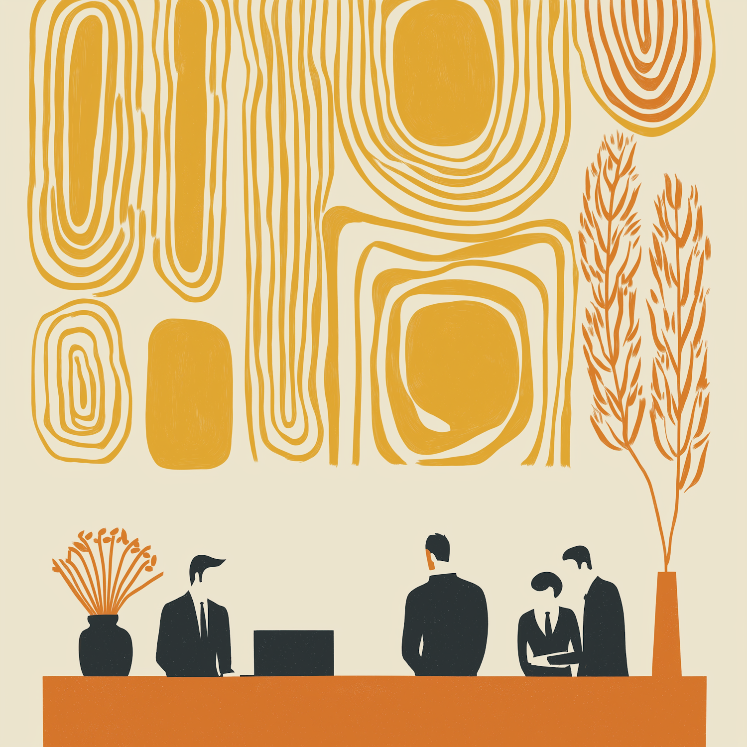 Stylized office scene with abstract patterns, warm tones, and figures interacting at a desk, creating a modern and inviting atmosphere.