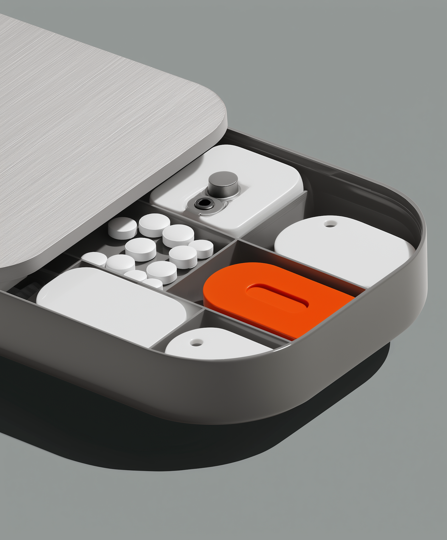Minimalist pill organizer with sleek compartments for pills and capsules, featuring a brushed metallic lid and modern design.
