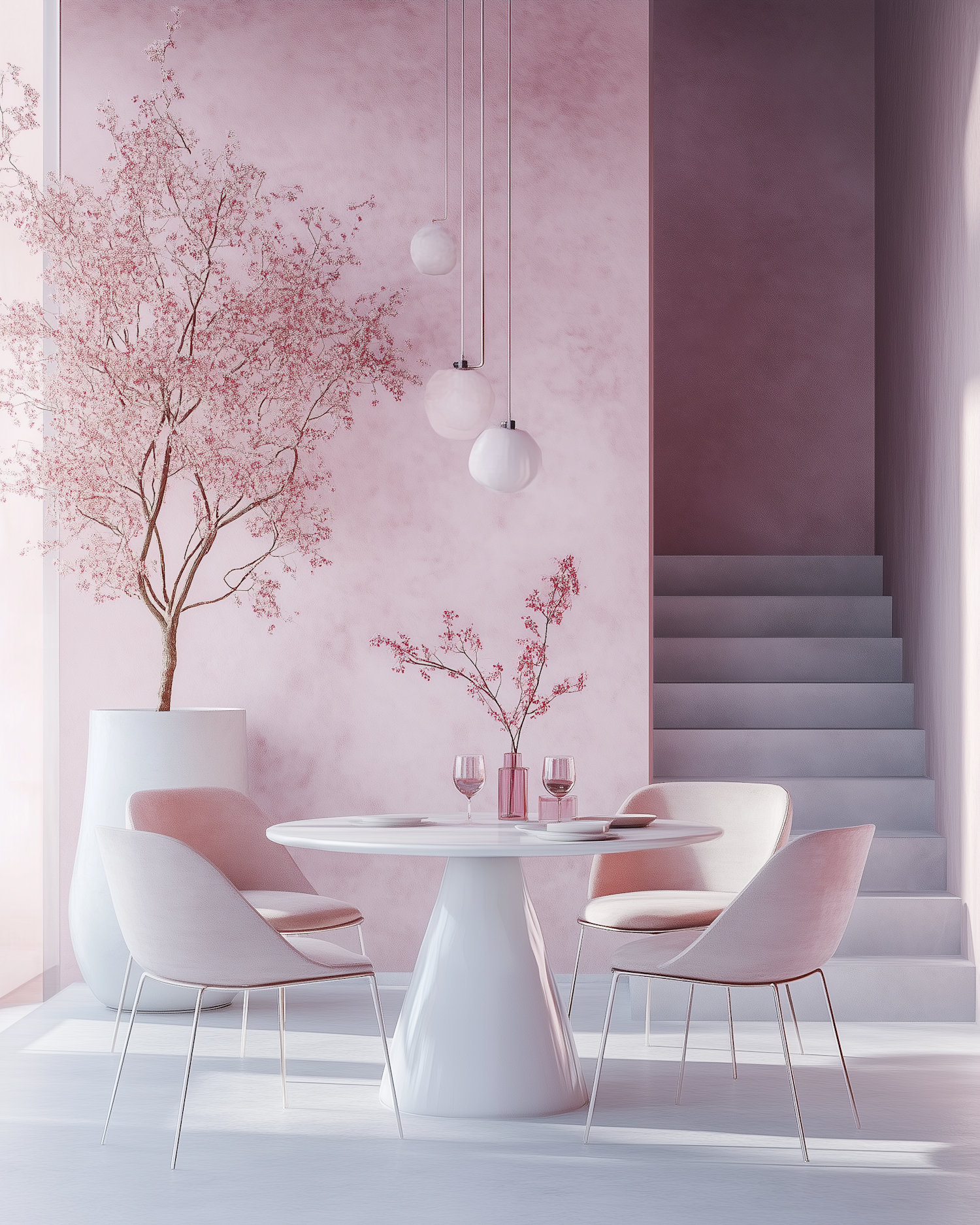 Modern dining space with pink tones, white table, pastel chairs, pendant lights, and a flowering tree for a serene, stylish vibe.