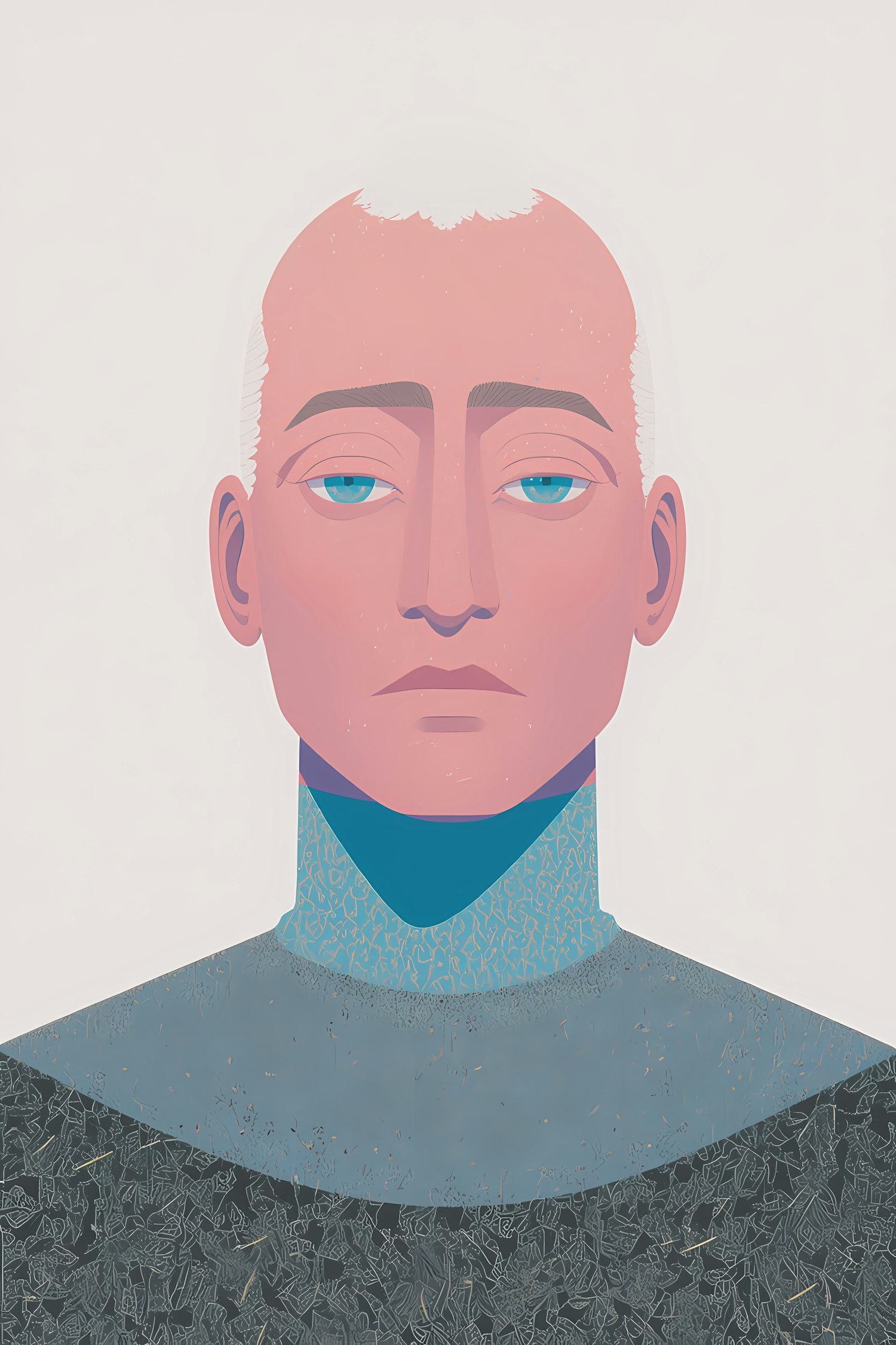 Stylized portrait illustration of a person with pale skin, light blue eyes, and short white hair, wearing a patterned high-collar outfit.
