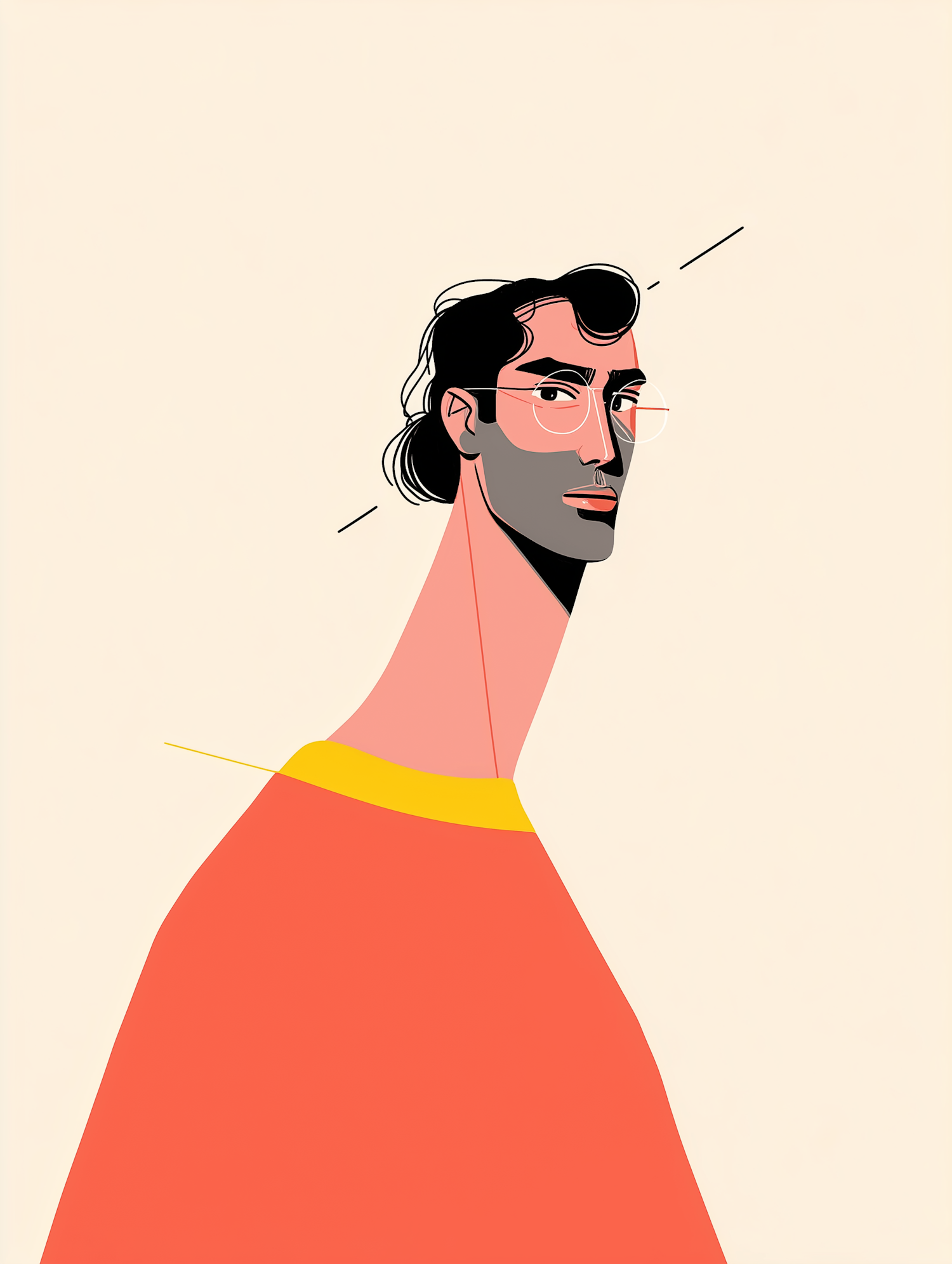 Stylized illustration of a person with glasses, dark hair, and vibrant red and yellow clothing on a light beige background.