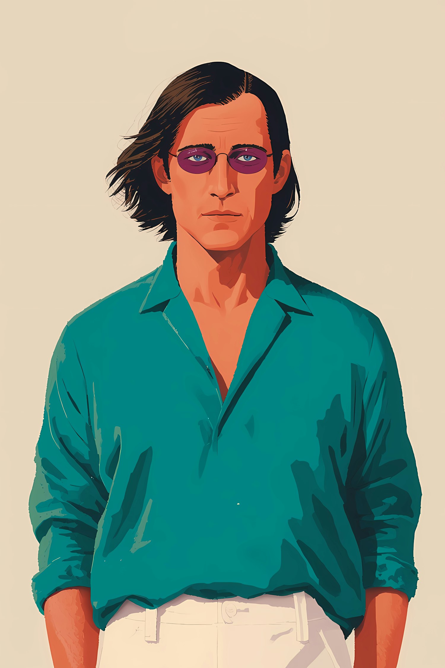 Stylized illustration of a person with dark hair, teal shirt, and white pants, set against a minimalist background.