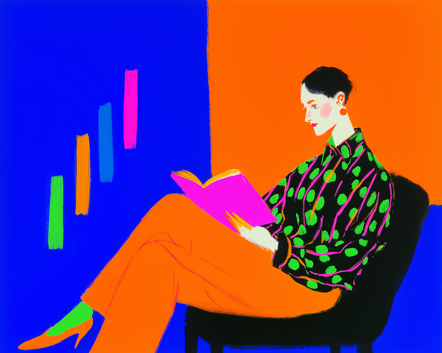A colorful illustration of a person reading, featuring bold patterns and vibrant hues in a modern, artistic style.