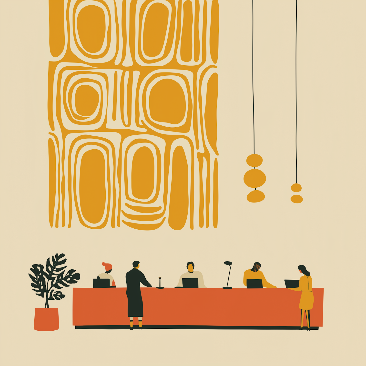 Modern reception desk illustration with abstract decor, warm tones, and minimalistic design. Perfect for contemporary office concepts.