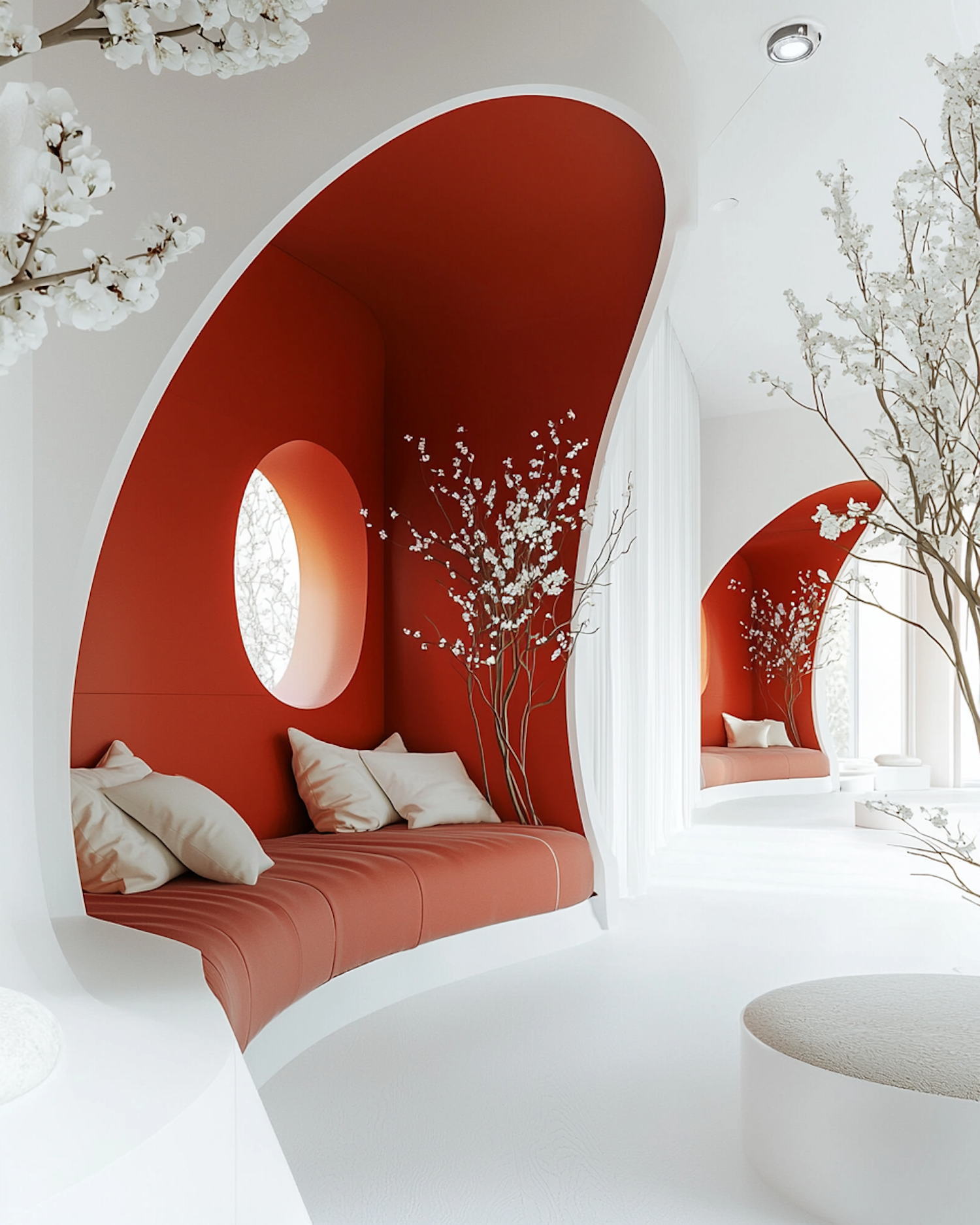 Modern interior with bold red alcoves, white cushions, and flowering branches. Minimalist design with natural light and soft contrasts.