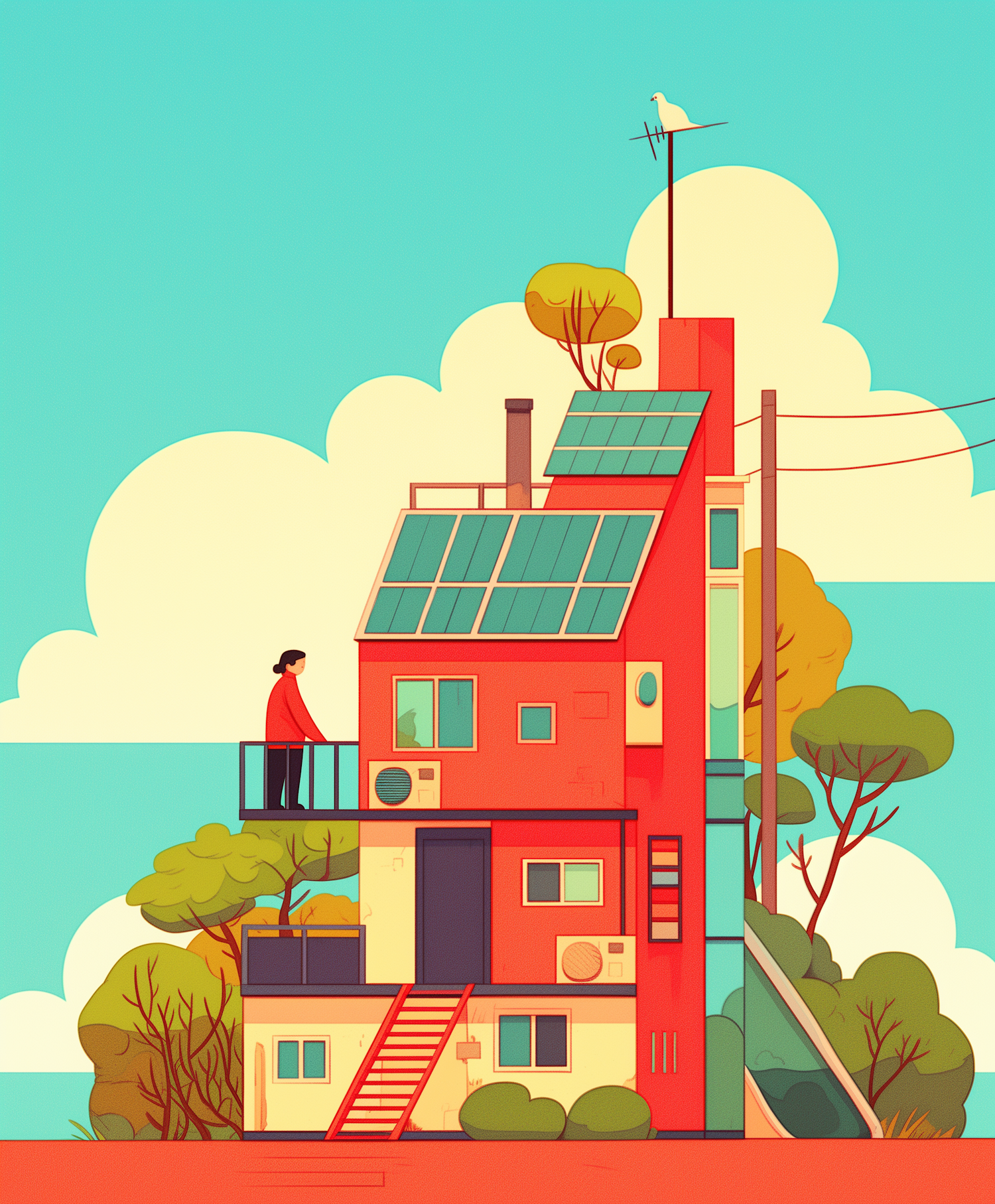Colorful illustration of a modern house with solar panels, surrounded by trees, and a person on the balcony under a bright blue sky.