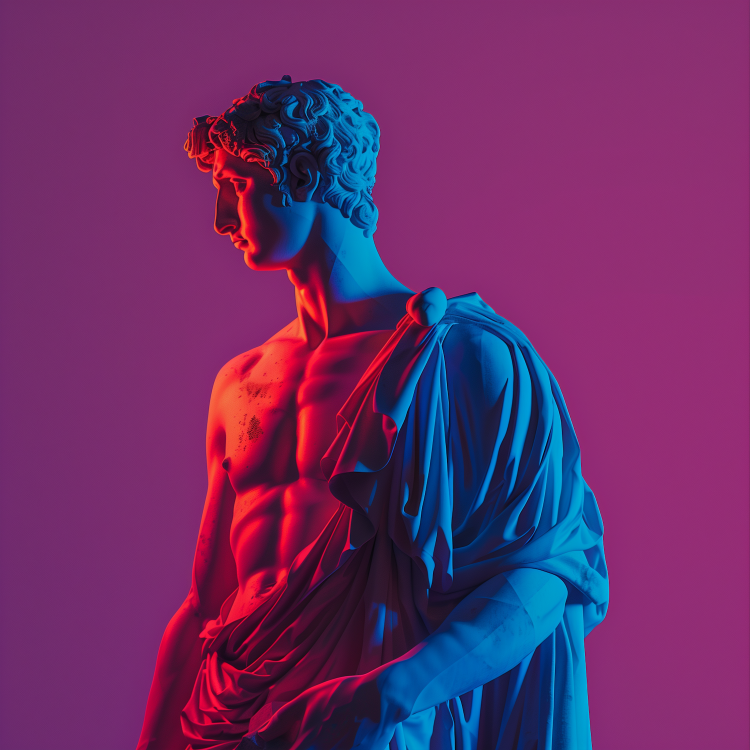 A classical marble statue illuminated with vibrant red and blue lighting against a purple background, creating a striking visual contrast.