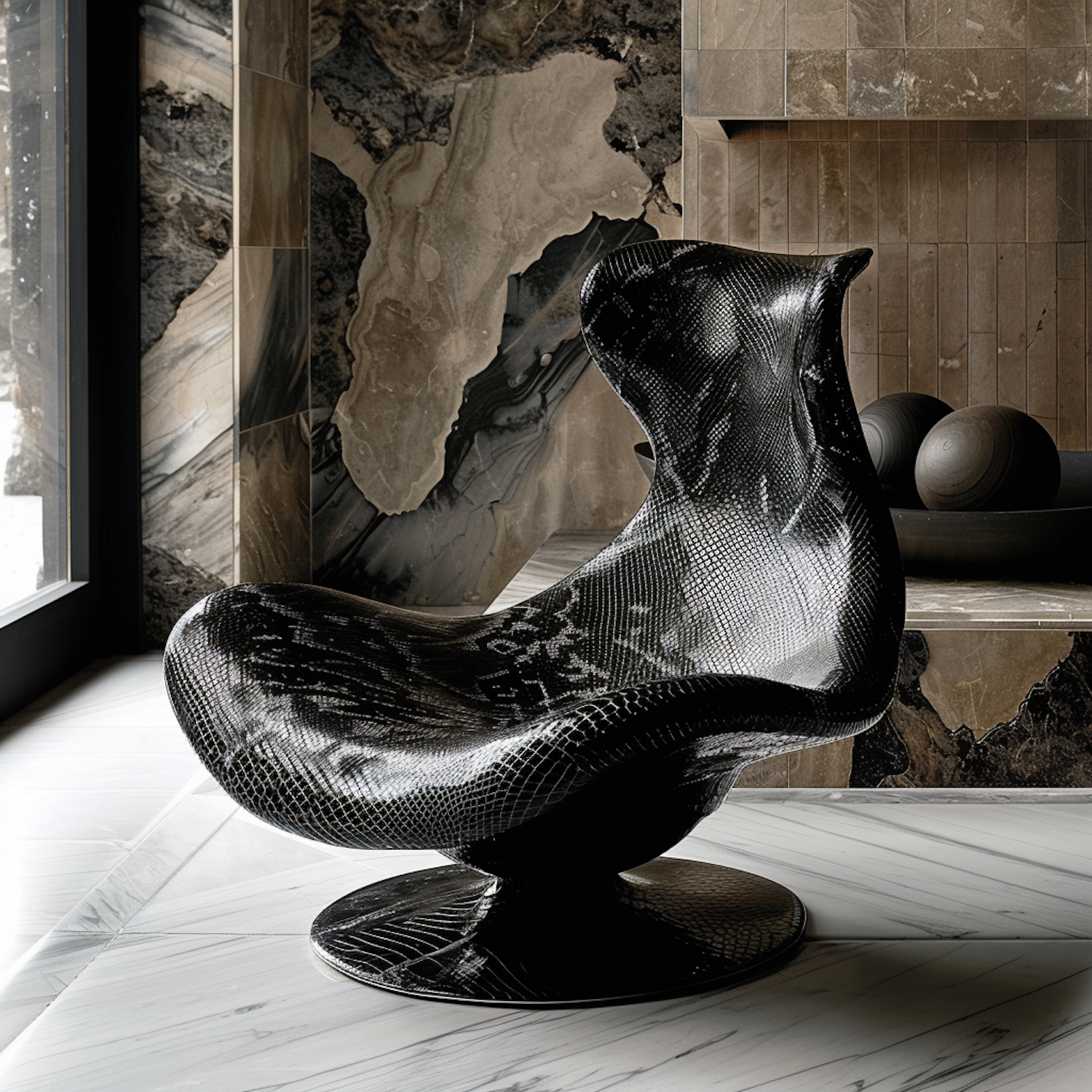 Sculptural black chair with snakeskin texture in a luxurious marble interior, featuring dramatic veined walls and minimalist decor.