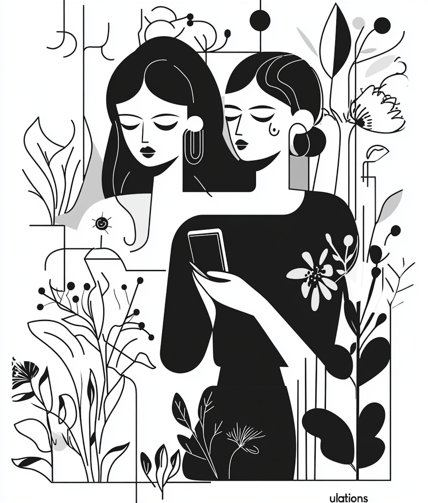 Stylized black and white illustration of two women with floral and geometric elements, blending nature and technology.