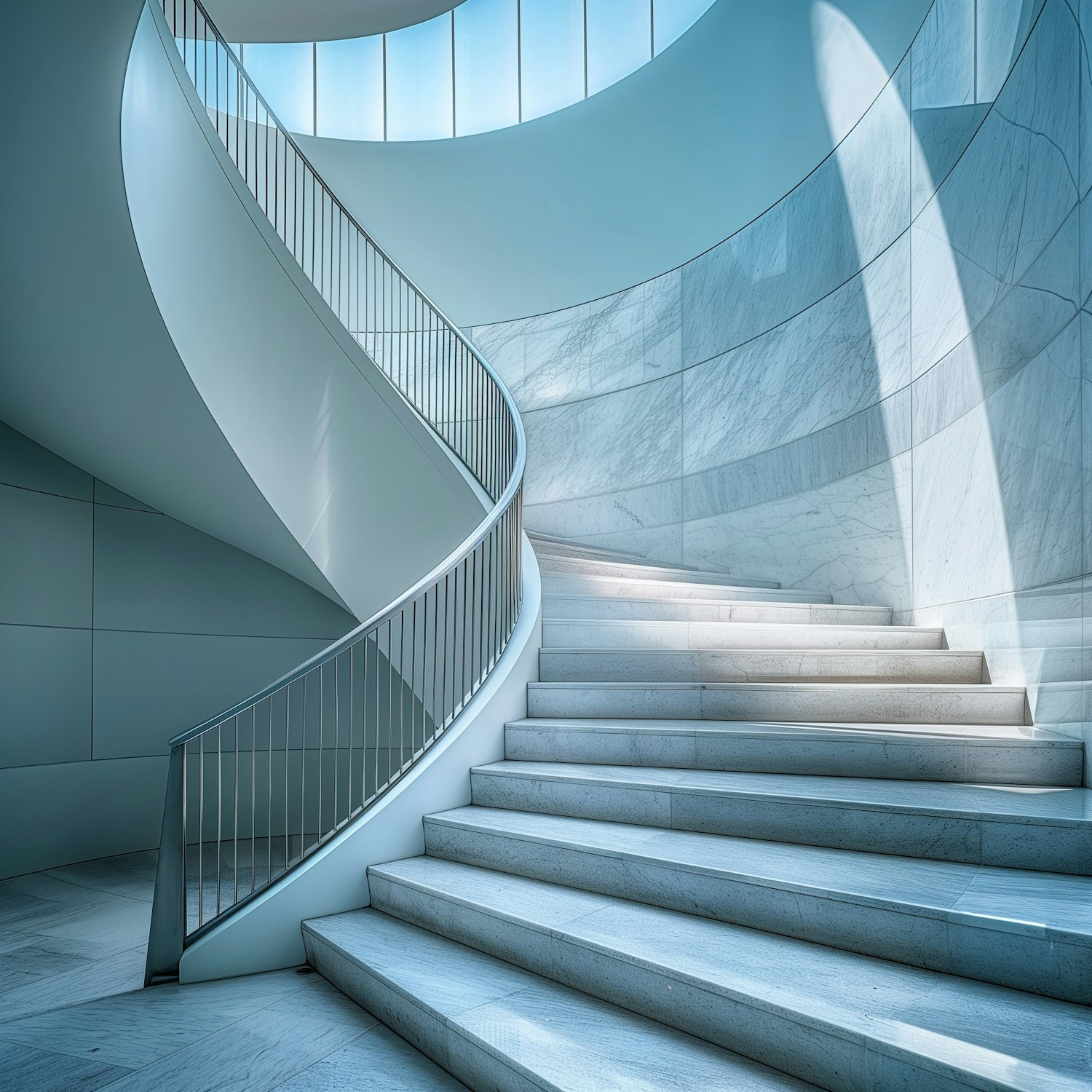 Elegant spiral staircase with marble steps and minimalist railing in a sunlit, modern interior space.