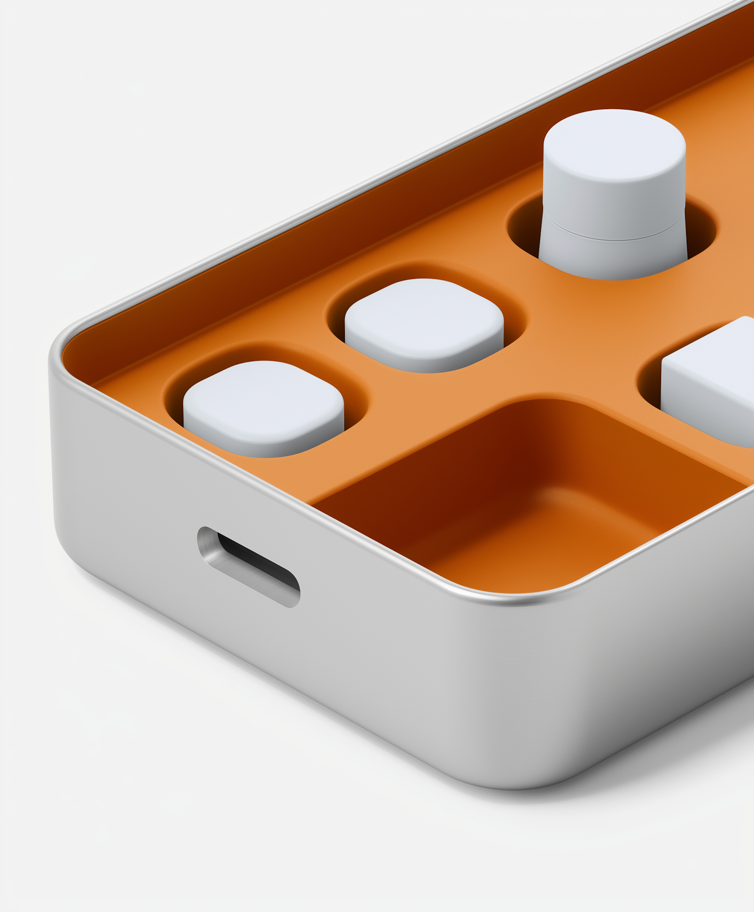 Minimalist storage tray with orange compartments and white objects, featuring a sleek silver finish and modern design.