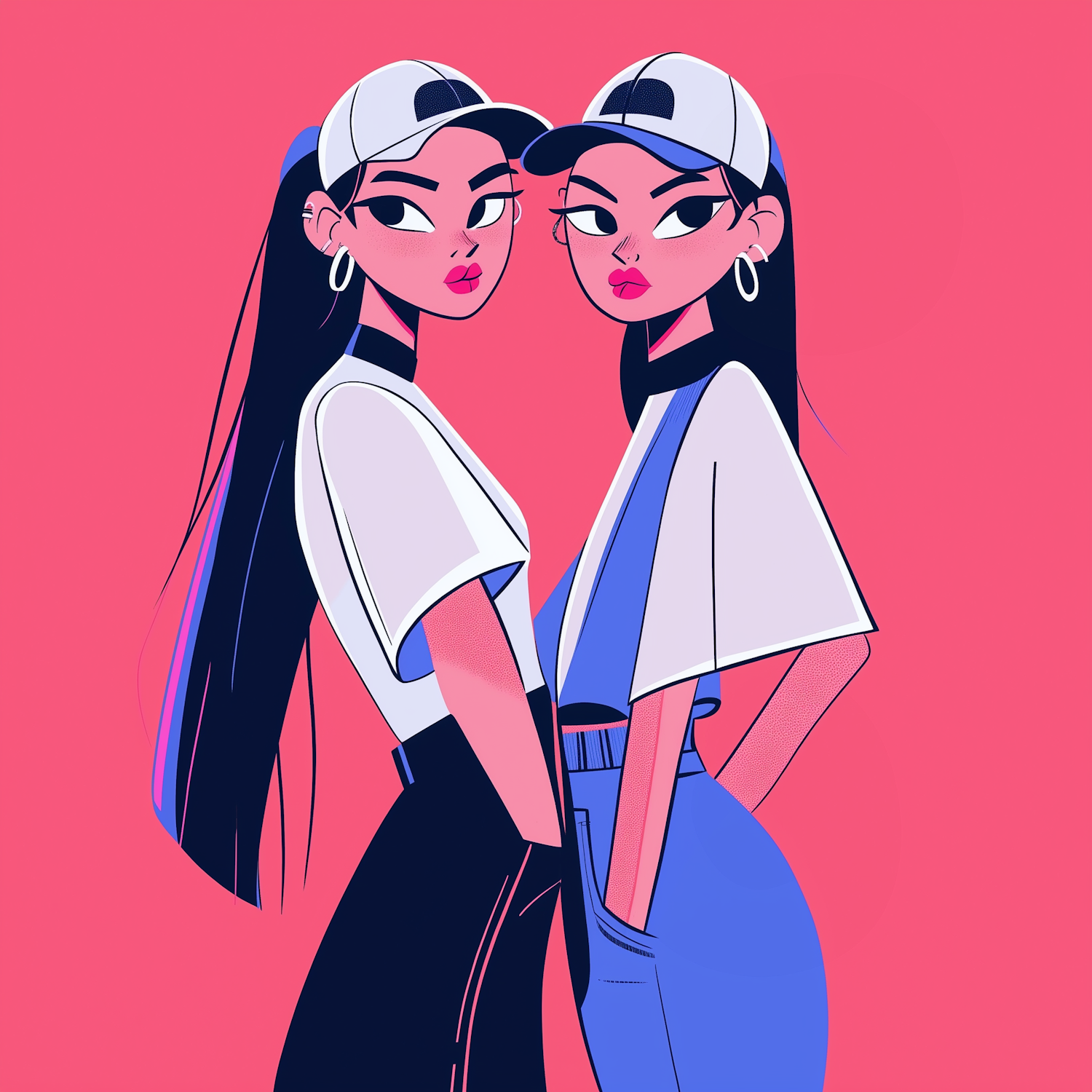 Stylized illustration of two animated characters with long black hair, white caps, and casual outfits against a vibrant pink background.