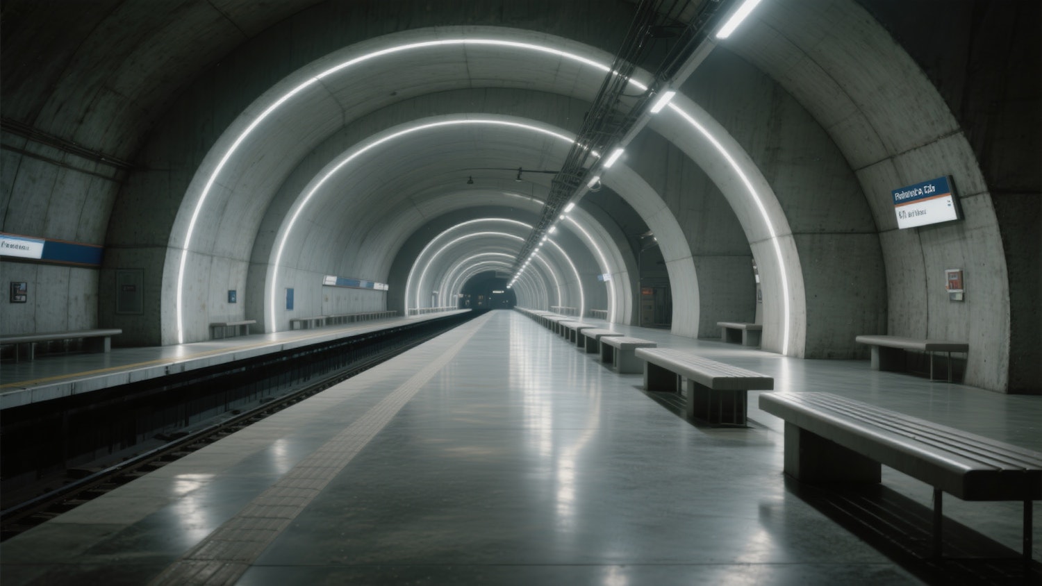 A subterranean metro station with vaulted arches, ambient glow from hidden LED strips, curved concrete forms, vanishing point perspective, moody editorial vibe