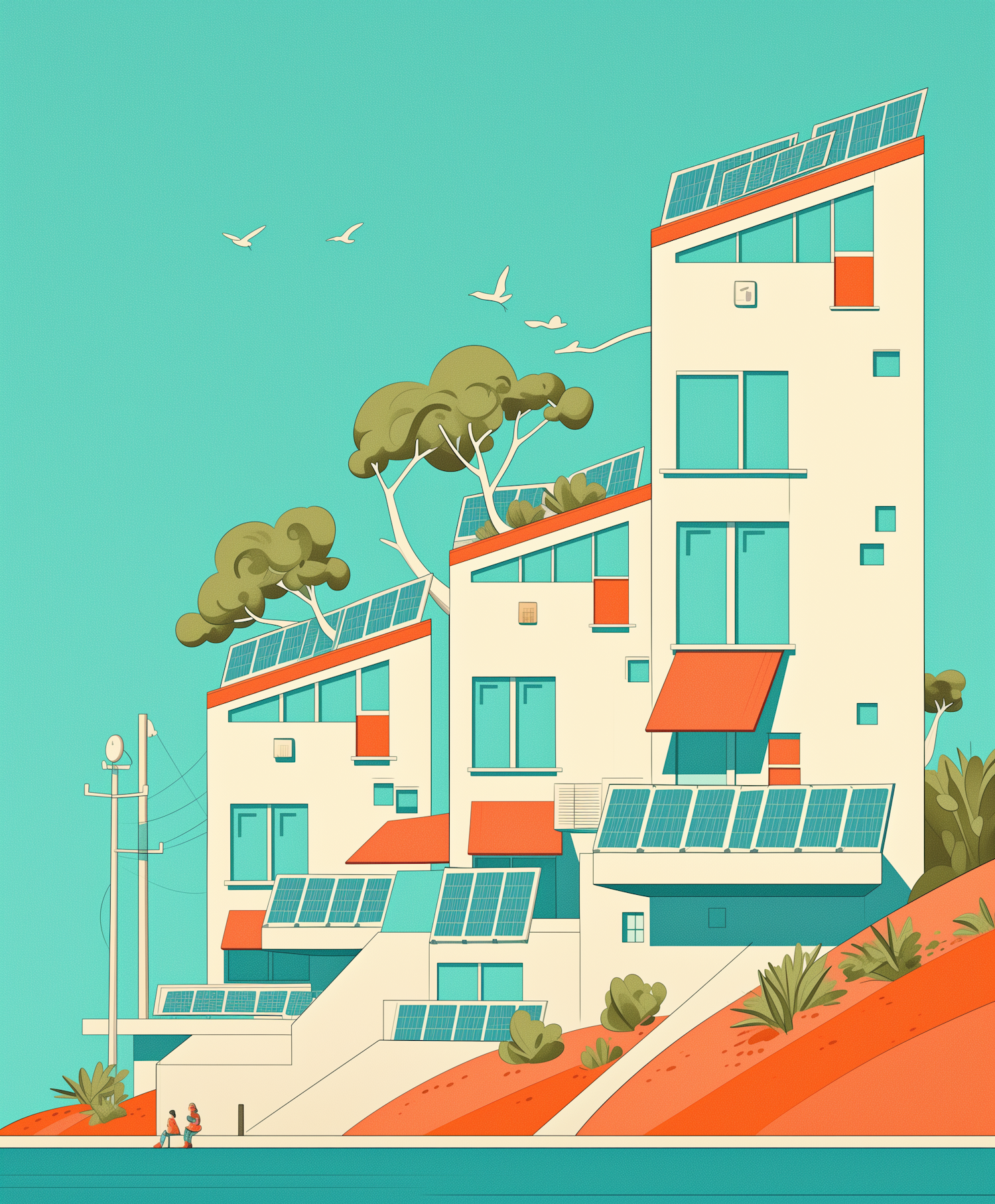 Stylized illustration of eco-friendly buildings with solar panels, teal and orange hues, and lush greenery on a sloped terrain.