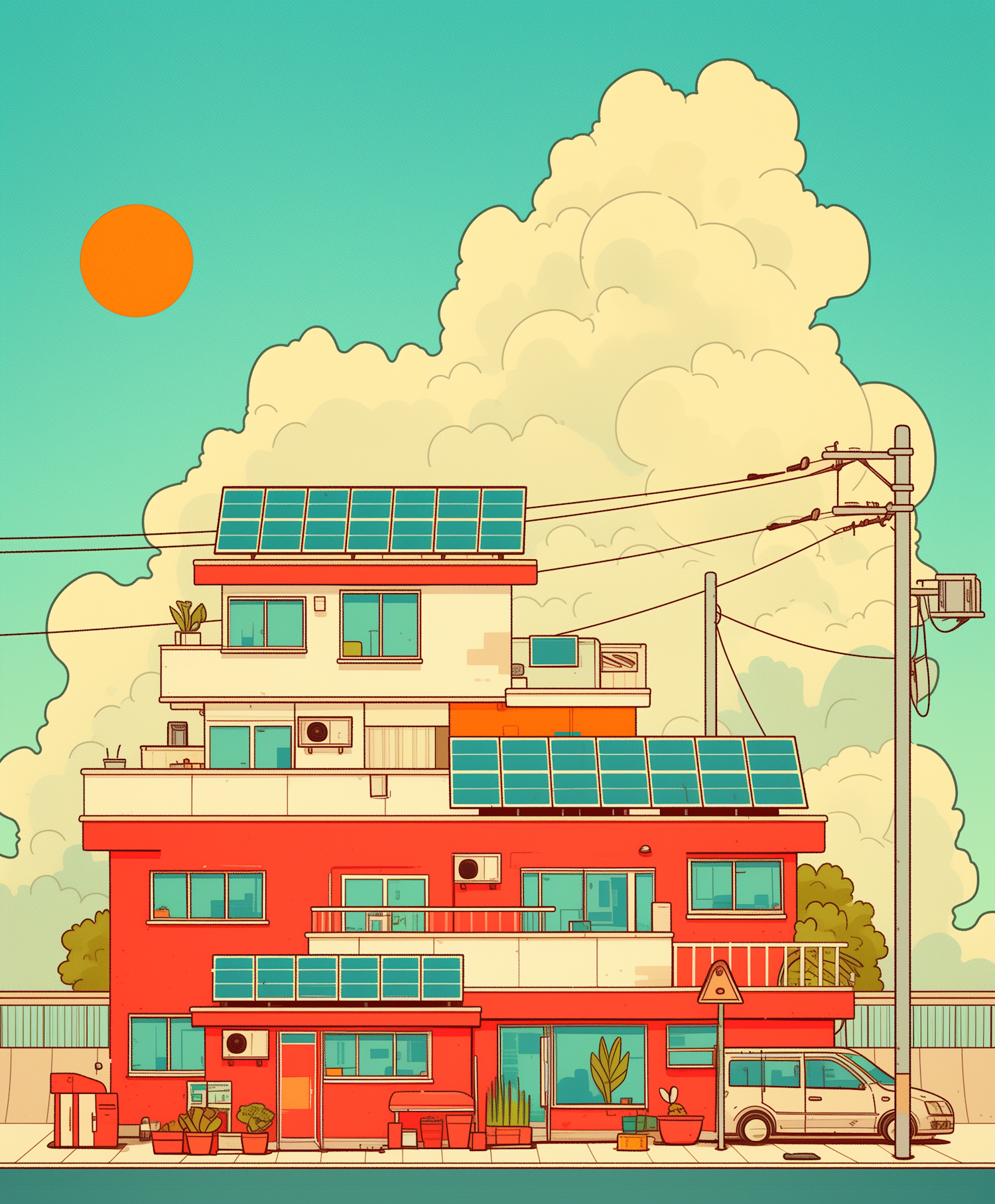 Colorful illustration of a modern building with solar panels, set against a bright sky with clouds and sun. Urban and eco-friendly vibe.