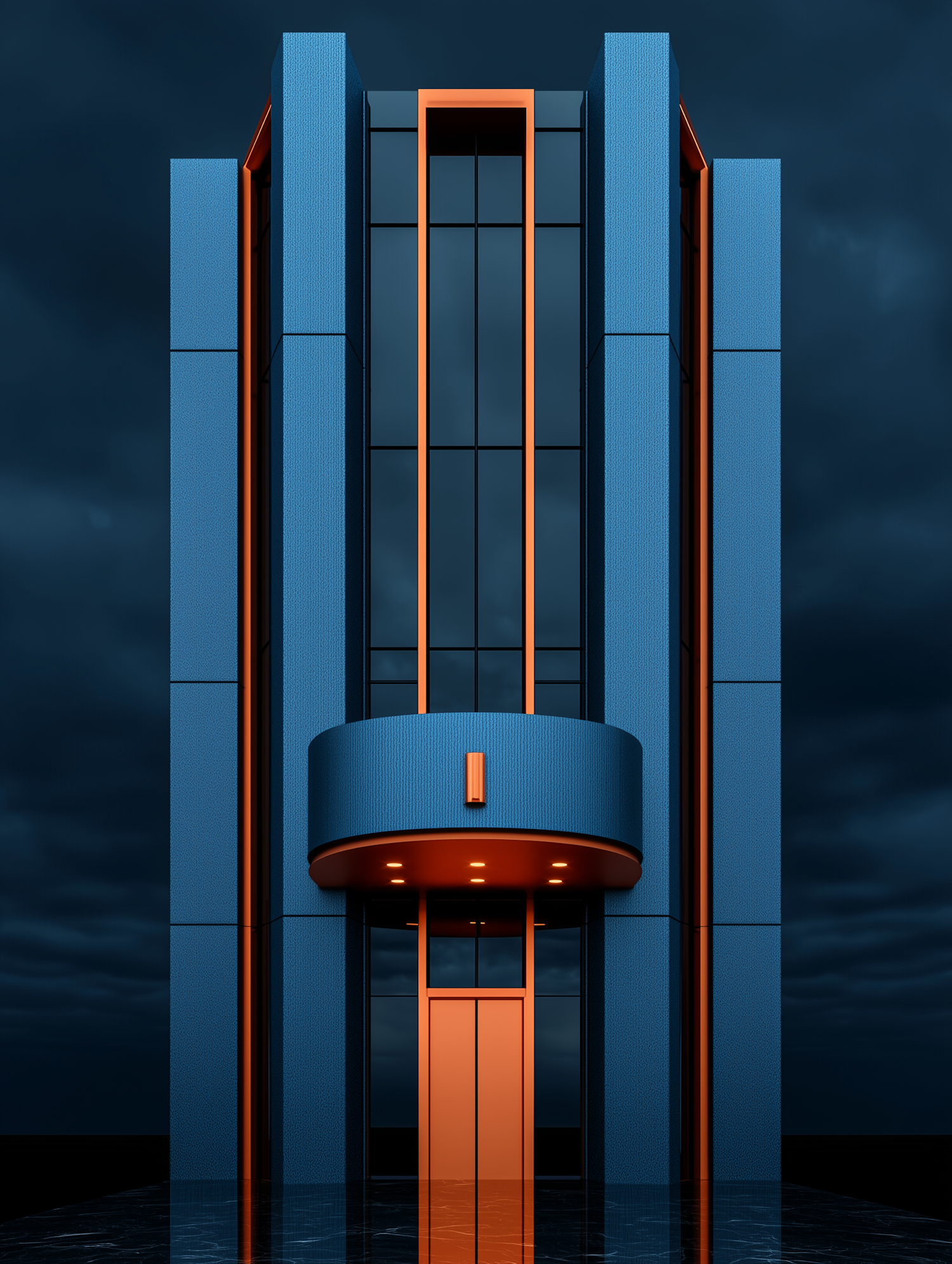 Modern blue and orange building with sleek glass panels and dramatic lighting against a dark, cloudy sky.
