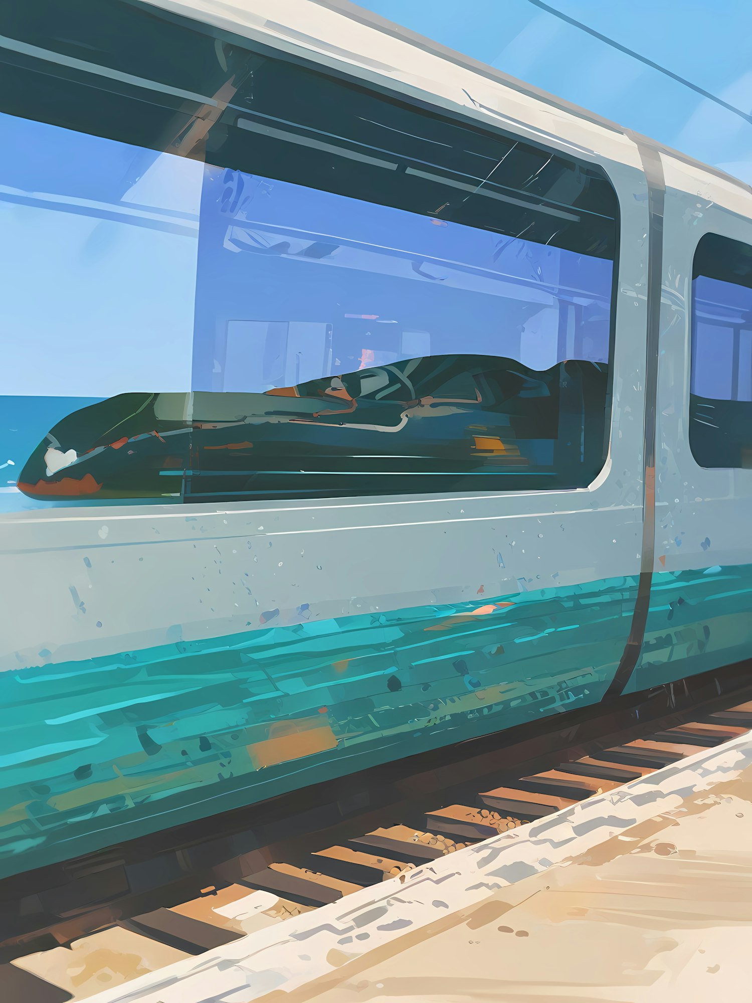 Stylized illustration of a sleek train with teal accents, reflecting a bright blue sky, traveling on detailed railway tracks.