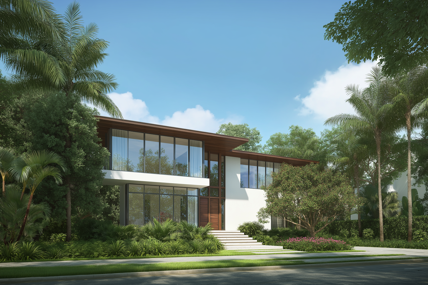 Modern two-story house with large glass windows, white walls, and wooden accents, surrounded by lush tropical greenery and palm trees.