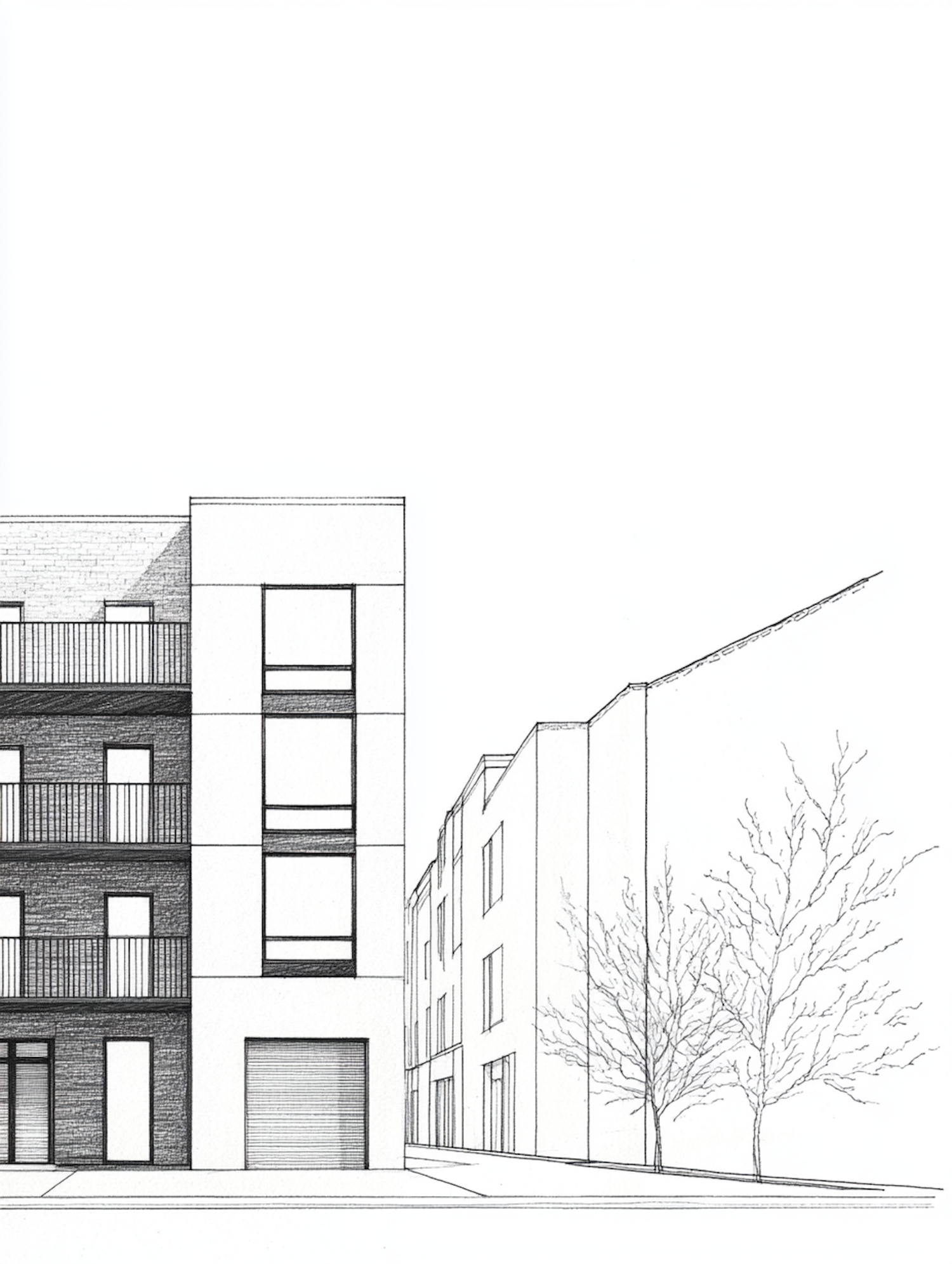 Architectural sketch of a modern urban building with balconies and large windows, set on a street corner with leafless trees.