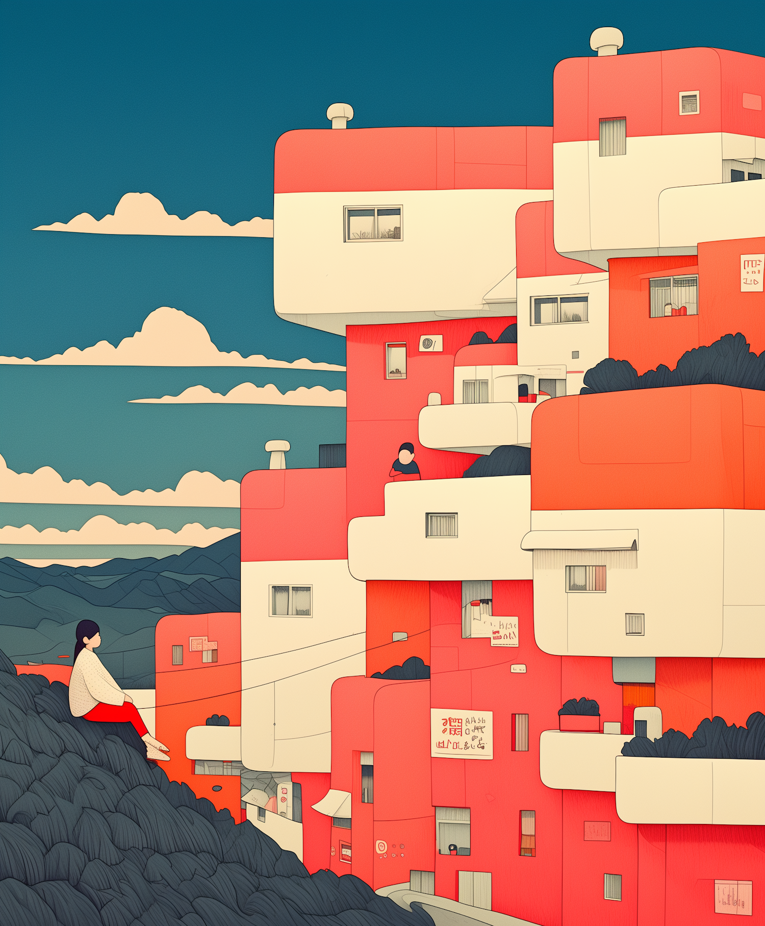 Futuristic cityscape illustration with modular red and white buildings, featuring people and a stylized sky.