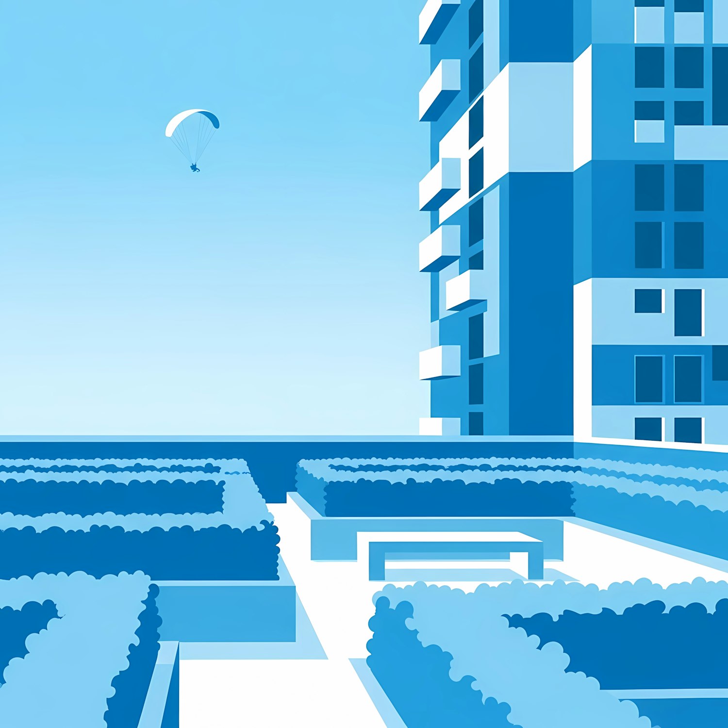 Stylized blue-toned illustration of a modern building, hedge maze, and a paraglider in a clear sky, evoking a serene urban vibe.